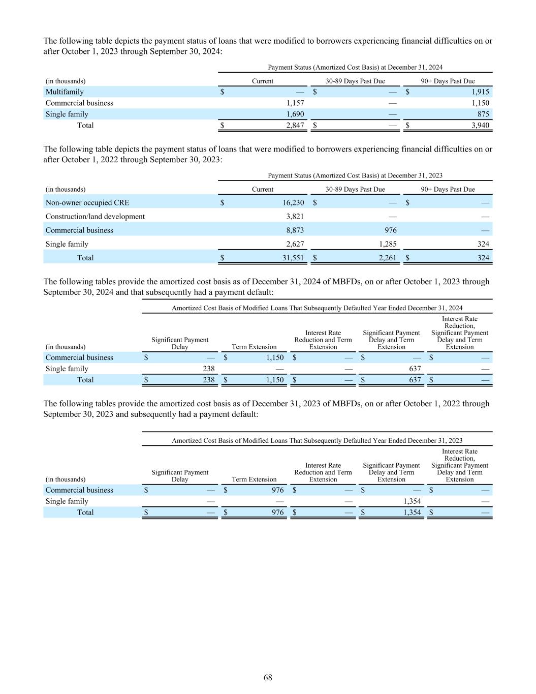 下表描述了在2023年10月1日或之后至2024年9月30日期间修改为遇到财务困难的借款人的贷款的付款情况:2024年12月31日的付款情况(摊余成本基准)(单位:千)当前逾期30-89天逾期90 +天逾期多户家庭$ — $ — $ 1,915商业业务1,157 — 1,150单户家庭1,690 — 875总计$ 2,847 $ — $ 3,940下表描述了在2022年10月1日或之后至9月30日期间修改为遇到财务困难的借款人的贷款的付款情况,2023:2023年12月31日的付款情况(摊余成本基础)(单位:千)当前逾期30-89天逾期90 +天逾期非业主占用CRE 16,230美元— $ —建筑/土地开发3,821 ——商业业务8,873976 —单户家庭2,6271,285324总计31,551美元2,261美元324下表提供了MBFDs截至2024年12月31日、2023年10月1日或之后至2024年9月30日且随后发生付款违约的摊余成本基础:随后违约年度截至12月31日的修改贷款的摊余成本基础,2024年(单位:千)重大付款延迟期限延长利率降低和期限延长重大付款延迟和期限延长利率降低、重大付款延迟和期限延长商业业务$ — $ 1,150 $ — $ — $ —单一家庭238 —— 637 —总计$ 238 $ 1,150 $ — $ 637 $ —下表提供了截至2023年12月31日MBFDs在2022年10月1日或之后至9月30日的摊余成本基础,2023和随后发生付款违约:随后发生违约的修改后贷款的摊余成本基础截至2023年12月31日止年度(单位:千)重大付款延迟期限延长利率降低和期限延长重大付款延迟和期限延长利率降低、重大付款延迟和期限延长商业业务$ — 976 $ — $ — $ —单一家庭——1,354 —总计$ — 976 $ — 1,354 $ — 68