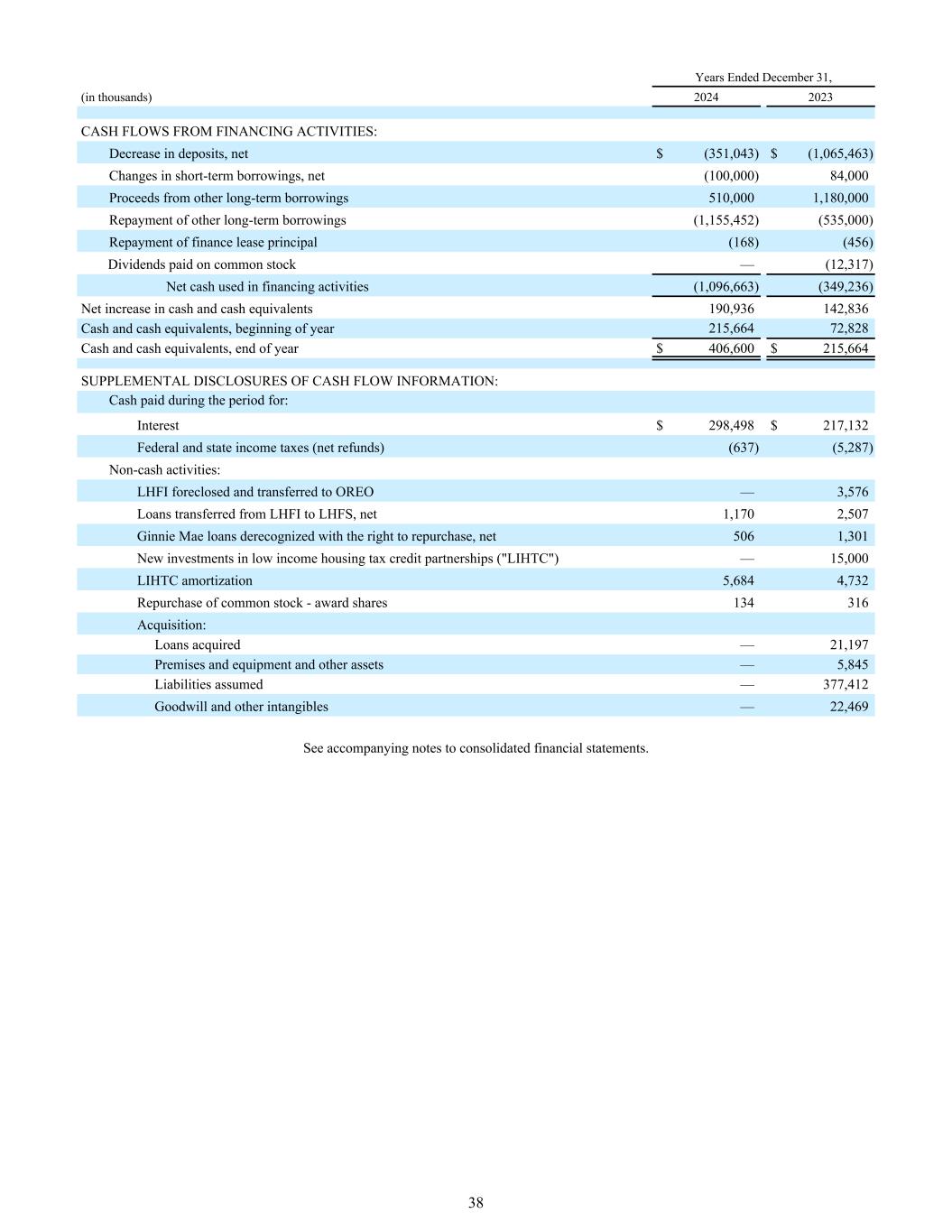 筹资活动现金流量:存款减少,净额(351,043)美元(1,065,463)短期借款变动,净额(100,000)84,000其他长期借款收益510,0001,180,000偿还其他长期借款(1,155,452)(535,000)偿还融资租赁本金(168)(456)支付普通股股利—(12,317)筹资活动使用的现金净额(1,096,663)(349,236)现金及现金等价物净增加额190,936142,836现金及现金等价物,年初215,66472,828现金及现金等价物,年末406,600美元215,664美元现金流信息的补充披露:期间支付的现金:利息298,498美元217,132美元联邦和州所得税(净退款)(637)(5,287)非现金活动:LHFI止赎并转移到OREO ——从LHFI转移到LHFS的3,576笔贷款,净额1,1702,507 Ginnie Mae贷款终止确认并有权回购,净额5061,301对低收入住房税收抵免合伙企业(“LIHTC”)的新投资— 15,000 LIHTC摊销5,6844,732回购普通股-奖励股份134316收购:获得的贷款— 21,197处房产和设备及其他资产—承担的5,845项负债— 377,412商誉和其他无形资产—截至12月31日的22,469年,(单位:千)20242023见合并财务报表附注。38