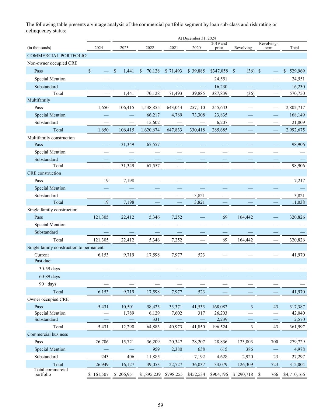 下表按贷款子类和风险评级或拖欠状态对商业投资组合部分进行了年份分析:截至12月31日,2024年(单位:千)202420232022202120202019和以前的循环循环期限总额商业投资组合非业主占用CRE通票$ — 1,441美元$ 70,128美元$ 71,493美元$ 39,885美元$ 347,058美元$(36)$ — $ 529,969特别提款—————— 24,551 —— 24,551不合格———— 16,230 —— 16,230合计—— 1,44170,12871,49339,885387,839(36)—— 570,750多户通票1,650106,4151,538,855643,044257,110255,643 —— 2,802,717特别提款—— 66,2174,78973,30823,835 —— 168,149不合格—— 15,602 —— 6,207 —— 21,809合计1—— 2,992,675张多户建设通— 31,34967,557 —————— 98,906张专提————————————不达标————————合计—— 31,34967,557 —————— 98,906张CRE建设通197,198 ———————— 7,217张专提————————不达标———— 3,821 —— 3,821合计197,198 —— 3,821 —— 11,038张单户建设通121,30522,4125,3467,252 — 69164,442 — 320,826特别提——————————不达标————————合计121,30522,4125,3467,252 — 69164,442 — 320,826单户建设至永久现6,1539,71917,5987,977523 ———— 41,970逾期:30-59天—————————— 60-89天—————— 90 +天————————合计6,1539,71917,5987,977523 ———— 41,970业主占用CRE通票5,43110,50158,42333,37141,533168,082343317,387特别提款— 1,7896,1297,60231726,203 —— 42,040不合格—— 331 —— 2,239 —— 2,570合计5,43112,29064,88340,97341,850196,524343361,997商业通票26,70615,72136,20920,34728,20728,836123,0037002797,729特别提款—— 9592,380638615386 — 4,978不合格24340611,885 — 7,1924,6282,9202327,297合计26,94916,12749,05322,72736,03734,0$ 766 $ 4,710,166 59