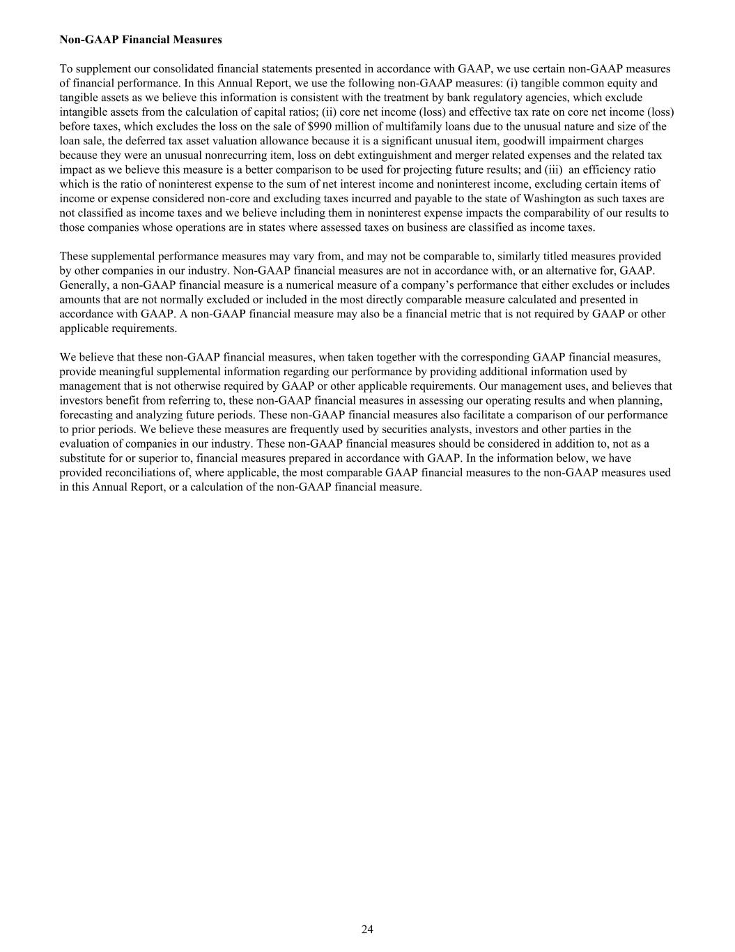 非GAAP财务指标为了补充我们按照GAAP提出的合并财务报表,我们使用了某些非GAAP财务业绩指标。在这份年度报告中,我们使用了以下非公认会计原则衡量标准:(i)有形普通股权益和有形资产,因为我们认为这些信息与银行监管机构的处理方式一致,银行监管机构将无形资产排除在资本比率的计算之外;(ii)核心净收入(亏损)和税前核心净收入(亏损)的有效税率,其中不包括因贷款出售的不寻常性质和规模而导致的出售9.9亿美元多户家庭贷款的损失,递延税项资产估值备抵,因为这是一个重大的不寻常项目,商誉减值费用,因为它们是一个不寻常的非经常性项目,债务清偿损失和合并相关费用以及相关的税收影响,因为我们认为这一衡量标准是一个更好的比较,可用于预测未来的结果;(iii)效率比率,即非利息费用与净利息收入和非利息收入之和的比率,不包括某些被视为非核心的收入或费用项目,不包括向华盛顿州产生和应付的税款,因为这些税款不属于所得税,我们认为将其列入非利息费用会影响我们的结果与那些业务在业务评估税款被归类为所得税的州的公司的可比性。这些补充绩效衡量标准可能与我们行业中其他公司提供的类似标题的衡量标准不同,也可能无法与之相比较。非GAAP财务指标不符合GAAP,也不是GAAP的替代方案。通常,非GAAP财务计量是对公司业绩的数字计量,它排除或包括通常不排除或包括在根据GAAP计算和列报的最直接可比计量中的金额。非GAAP财务指标也可能是GAAP或其他适用要求不要求的财务指标。我们认为,这些非GAAP财务指标,当与相应的GAAP财务指标一起采取时,通过提供管理层使用的、GAAP或其他适用要求没有要求的额外信息,为我们的业绩提供了有意义的补充信息。我们的管理层在评估我们的经营业绩以及在规划、预测和分析未来期间时使用这些非公认会计准则财务指标,并相信投资者将从中受益。这些非公认会计准则财务指标也有助于将我们的业绩与前期进行比较。我们认为,这些措施是证券分析师、投资者等各方在评估我们行业内公司时经常使用的。这些非GAAP财务指标应被视为根据GAAP编制的财务指标的补充,而不是替代或优于。在下面的信息中,我们在适用的情况下提供了与本年度报告中使用的非GAAP衡量标准最具可比性的GAAP财务衡量标准的对账,或者非GAAP财务衡量标准的计算。24