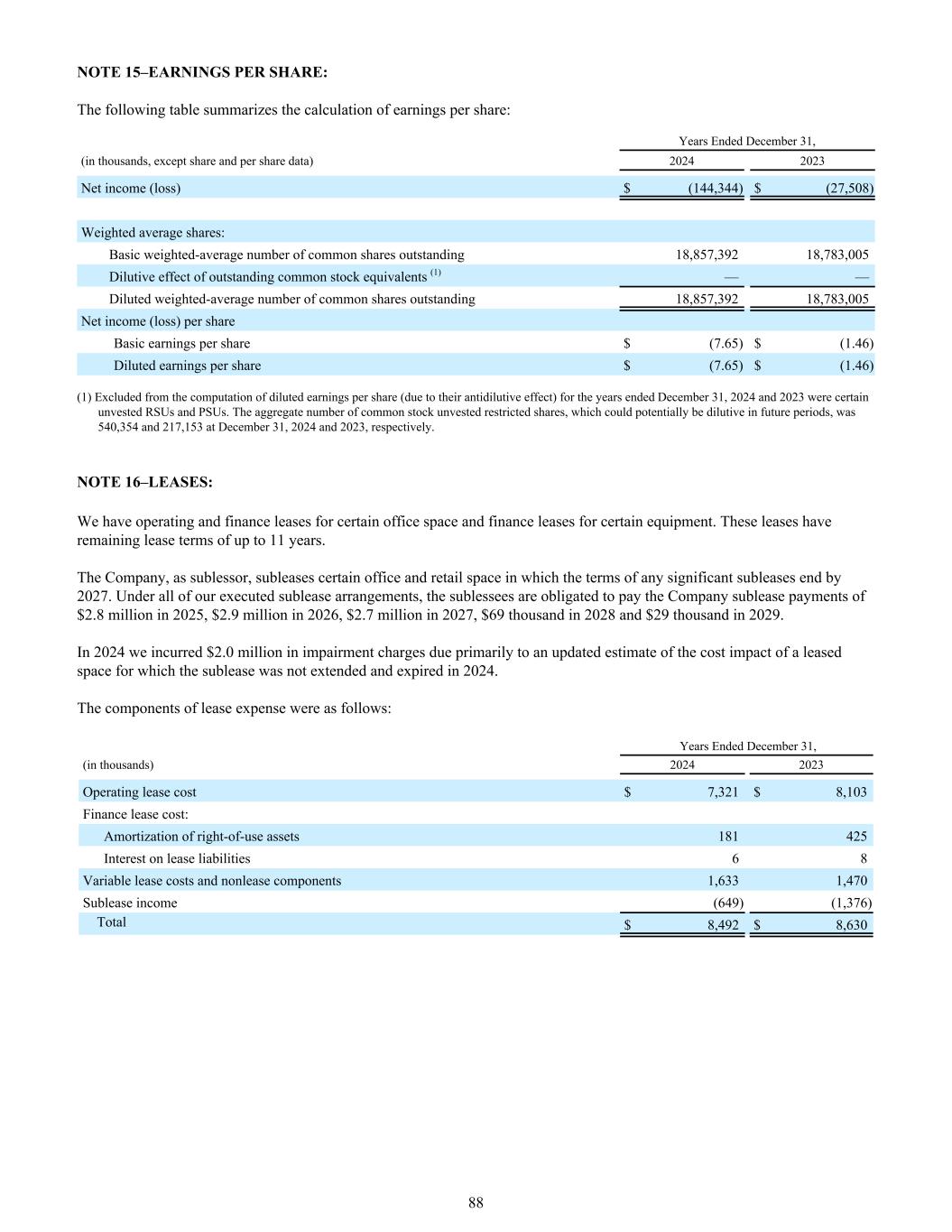 注15 –每股收益:下表汇总了每股收益的计算:截至12月31日止年度,(单位:千,除股份和每股数据外)20242023净收益(亏损)$(144,344)$(27,508)加权平均股:基本加权平均已发行普通股股数18,857,39218,783,005已发行普通股等价物的稀释影响(1)——稀释加权平均已发行普通股股数18,857,39218,783,005每股净收益(亏损)每股基本收益$(7.65)$(1.46)稀释每股收益$(7.65)$(1.46)(1)不包括在计算稀释后每股收益(由于其反稀释效应)截至2024年12月31日和2023年12月31日止年度的某些未归属的受限制股份单位和事业单位。截至2024年12月31日和2023年12月31日,可能在未来期间具有稀释性的普通股未归属限制性股票总数分别为540,354股和217,153股。注16 – LEASES:我们对某些办公空间有经营和融资租赁,对某些设备有融资租赁。这些租约的剩余租期最长可达11年。公司作为转租人,转租某些办公和零售空间,其中任何重大转租的条款将于2027年结束。根据我们所有已执行的转租安排,分租承租人有义务在2025年向公司支付280万美元、2026年290万美元、2027年270万美元、2028年6.9万美元和2029年2.9万美元的转租付款。2024年,我们产生了200万美元的减值费用,这主要是由于对转租未延期并于2024年到期的租赁空间的成本影响进行了更新估计。租赁费用构成部分如下:截至12月31日止年度,(单位:千)20242023经营租赁成本7,321美元8,103美元融资租赁成本:使用权资产摊销181425租赁负债利息68可变租赁成本和非租赁部分1,6331,470转租赁收入(649)(1,376)合计8,492美元8,63088