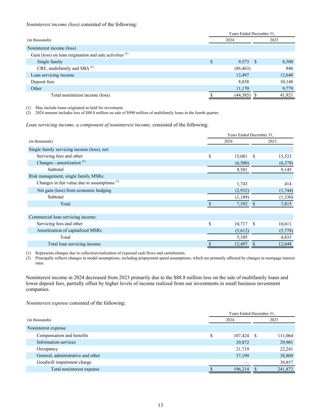 非利息收入(损失)包括:截至12月31日的年度,(以千为单位)20242023贷款发起和销售活动的非利息收入(损失)收益(损失)(1)单户家庭$ 9,573 $ 8,500 CRE、多户家庭和SBA(2)(86,463)846贷款服务收入12,49712,648存款费8,83810,148其他11,1709,779总非利息收入(损失)$(44,385)$ 41,921(1)可能包括为投资而产生的贷款。(2)2024年金额包括第四季度出售9.9亿美元多户家庭贷款损失8880万美元。贷款服务收入,非利息收入的一个组成部分,包括:截至12月31日的年度,(千)20242023单一家庭服务收入(损失),净额:服务费和其他15,081美元15,523美元变动-摊销(1)(6,500)(6,378)小计8,5819,145风险管理,单户MSR:由于假设(2)导致的公允价值变动(1,743414经济套期保值净收益(损失)(2,932)(1,744)小计(1,189)(1,330)总计$ 7,392 $ 7,815商业贷款服务收入:服务费和其他$ 10,717 $ 10,611资本化MSR摊销(5,612)(5,778)总计5,1054,833总贷款服务收入$ 12,497 $ 12,648(1)表示由于收取/实现预期现金流和缩减而导致的变动。(2)主要反映模型假设变化,包括提前还款速度假设,主要受抵押贷款利率变化影响。2024年非利息收入较2023年有所下降,主要是由于出售多户家庭贷款和较低的存款费用造成8880万美元的损失,部分被我们对小企业投资公司的投资实现的较高收入水平所抵消。非利息费用包括:截至12月31日的年度,(以千为单位)20242023非利息费用薪酬和福利$ 107,424 $ 111,064信息服务29,87229,901占用21,71922,241一般、行政和其他37,19938,809商誉减值费用— 39,857非利息费用总额$ 196,214 $ 241,87213