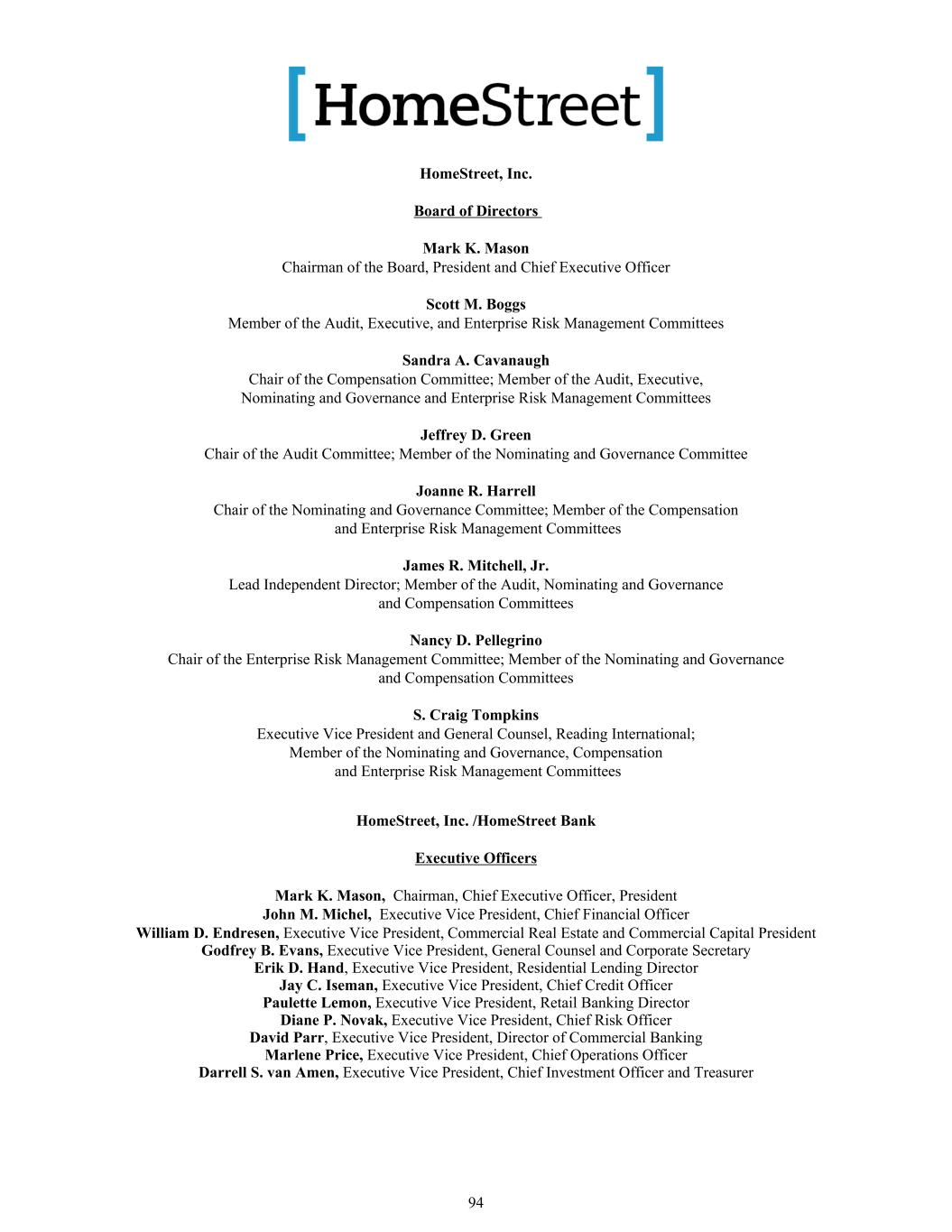 HomeStreet,Inc.董事会TERM0Mark K. Mason董事会主席、总裁兼首席执行官Scott M. Boggs审计、执行和企业风险管理委员会成员Sandra A. Cavanaugh薪酬委员会主席;审计、执行、提名和治理以及企业风险管理委员会成员Jeffrey D. Green审计委员会主席;提名和治理委员会成员Joanne R. Harrell提名和治理委员会主席;薪酬和企业风险管理委员会成员James R. Mitchell,Jr.首席独立董事;审计成员,提名、治理和薪酬委员会Nancy D. Pellegrino企业风险管理委员会主席;提名、治理和薪酬委员会成员S. Craig Tompkins,执行副总裁兼总法律顾问,全球阅读;提名和治理、薪酬和企业风险管理委员会成员,HomeStreet,Inc./HomeStreet银行执行官Mark K. Mason,董事长、首席执行官、总裁John M. Michel,执行副总裁、首席财务官TERMWilliam D. Endresen William D. Endresen,执行副总裁,商业房地产和商业资本总裁TERM0 Godfrey B. Evans Godfrey B. Evans,执行副总裁、总法律顾问兼公司秘书Erik D. Hand,执行副总裁、住宅贷款总监Jay C. Iseman、执行副总裁、首席信贷官Paulette Lemon、执行副总裁、零售银行业务总监Diane P. Novak、执行副总裁、首席风险官David Parr、执行副总裁、商业银行业务总监Marlene Price、执行副总裁、首席运营官Darrell S. van Amen、执行副总裁、首席投资官兼财务主管94