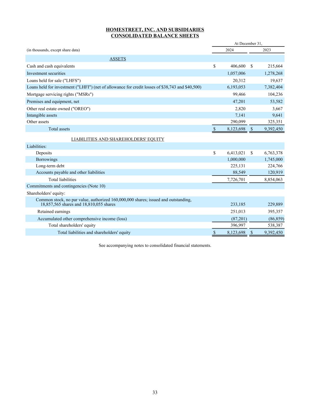 Homestreet, Inc.和子公司12月31日合并资产负债表,(单位:千,股份数据除外)20242023资产现金和现金等价物$ 406,600 $ 215,664投资证券1,057,0061,278,268持作出售贷款(“LHFS”)20,31219,637持作投资贷款(“LHFI”)(扣除信贷损失准备金38,743美元和40,500美元)6,193,0537,382,404抵押贷款服务权(“MSRs”)99,466 104,236处房产和设备,净额47,20153,582拥有的其他不动产(“OREO”)2,8203,667无形资产7,1419,641其他资产290,099325,351总资产$ 8,123,698 $ 9,392,450负债和股东权益负债:存款$ 6,413,021 $ 6,763,378借款1,000,0001,745,000长期债务225,131224,766应付账款和其他负债88,549120,919负债总额7,726,70188,854,063承诺和或有事项(注10)股东权益:普通股,无面值,授权160,000,000股;已发行和未偿还,18,857,565股和18,810,055股233,185229,889留存收益251,013395,357累计其他综合收益(亏损)(87,201)(86,859)股东权益总额396,997538,387负债和股东权益总额8,123,698美元9,392,450美元见合并财务报表附注。33