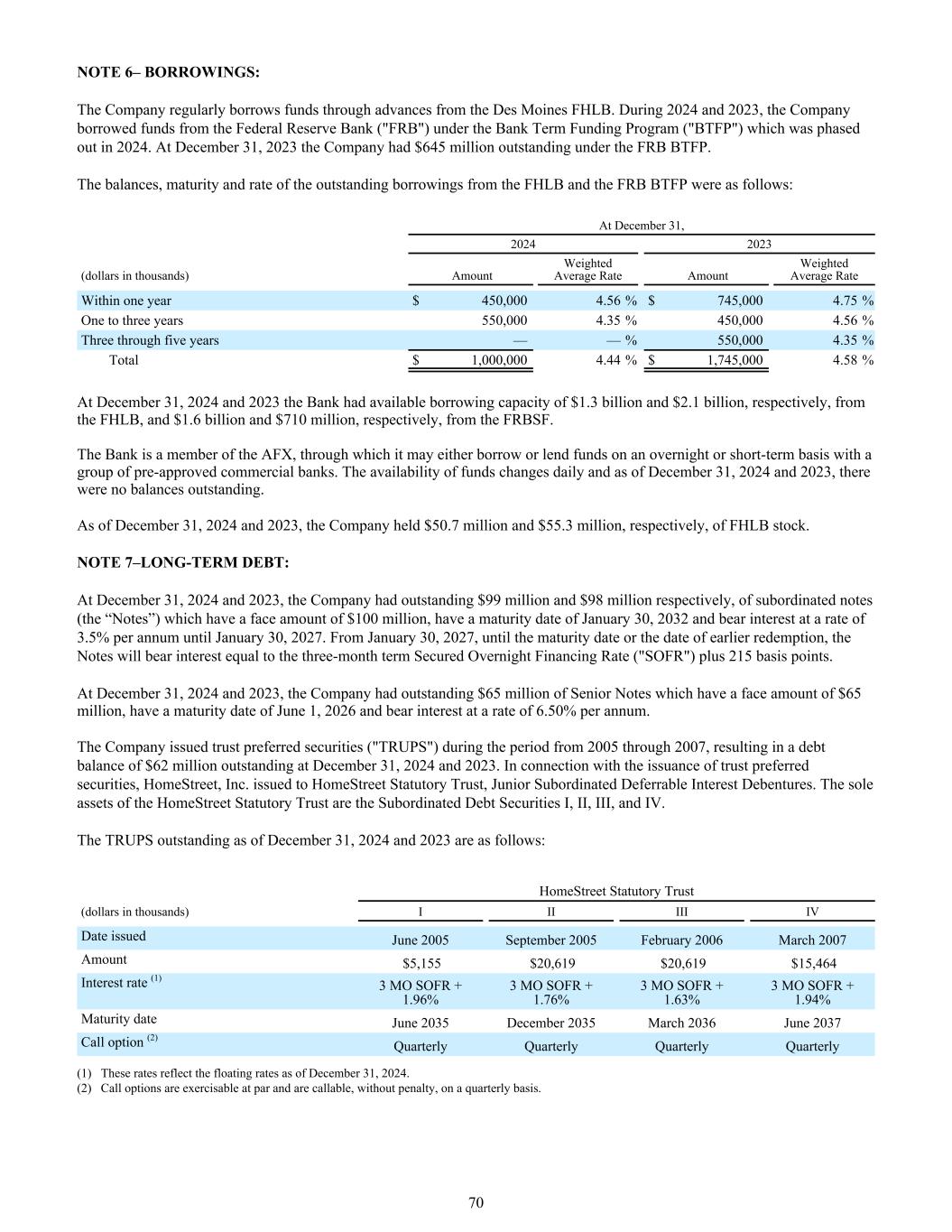 附注6 – Borrowings:公司定期通过Des Moines FHLB的垫款借入资金。在2024年和2023年期间,公司根据2024年逐步取消的银行定期资金计划(“BTFP”)从联邦储备银行(“FRB”)借入资金。截至2023年12月31日,该公司在FRB BTFP下有6.45亿美元的未偿债务。FHLB和FRB BTFP的未偿还借款余额、期限和利率如下:截至2024年12月31日2023年(千美元)金额加权平均利率金额一年内加权平均利率$ 450,0004.56% $ 745,0004.75%一至三年550,0004.35% 450,0004.56%三至五年——% 550,0004.35%总计$ 1,000,0004.44% $ 1,745,0004.58%截至2024年12月31日和2023年12月31日,该银行从FHLB的可用借款能力分别为13亿美元和21亿美元,以及FRBSF分别提供的16亿美元和7.1亿美元。该银行是AFX的成员,通过AFX,它可以与一组预先批准的商业银行进行隔夜或短期借贷。可用资金每日变动,截至2024年12月31日和2023年12月31日,没有未结余额。截至2024年12月31日和2023年12月31日,该公司分别持有5070万美元和5530万美元的FHLB股票。附注7 –长期债务:于2024年12月31日和2023年12月31日,公司分别有9900万美元和9800万美元的未偿还次级票据(“票据”),其面值为1亿美元,到期日为2032年1月30日,年利率为3.5%,直至2027年1月30日。自2027年1月30日起,直至到期日或提前赎回之日,票据的利息将等于三个月期限的有担保隔夜融资利率(“SOFR”)加上215个基点。在2024年12月31日和2023年12月31日,公司有6500万美元的未偿还优先票据,票面金额为6500万美元,到期日为2026年6月1日,年利率为6.50%。该公司在2005年至2007年期间发行了信托优先证券(“TRUPS”),导致2024年12月31日和2023年12月31日的未偿债务余额为6200万美元。就发行信托优先证券而言,HomeStreet,Inc.向HomeStreet法定信托发行了初级次级可延期利息债券。HomeStreet法定信托的唯一资产为次级债务证券I、II、III、IV。截至2024年12月31日和2023年未偿还的TRUPS如下:HomeStreet法定信托(单位:千美元)I II III IV发行日期2005年6月2005年9月2006年2月2007年3月金额$ 5,155 $ 20,619 $ 20,619 $ 15,464利率(1)3 MO SOFR + 1.96% 3 MO SOFR + 1.76% 3 MO SOFR + 1.63% 3 MO SOFR + 1.94%到期日2035年12月2035年12月2036年3月2037年6月认购期权(2)季度季度季度(1)这些利率反映了截至2024年12月31日的浮动利率。(2)认购期权可按面值行使,可按季度赎回,不受处罚。70