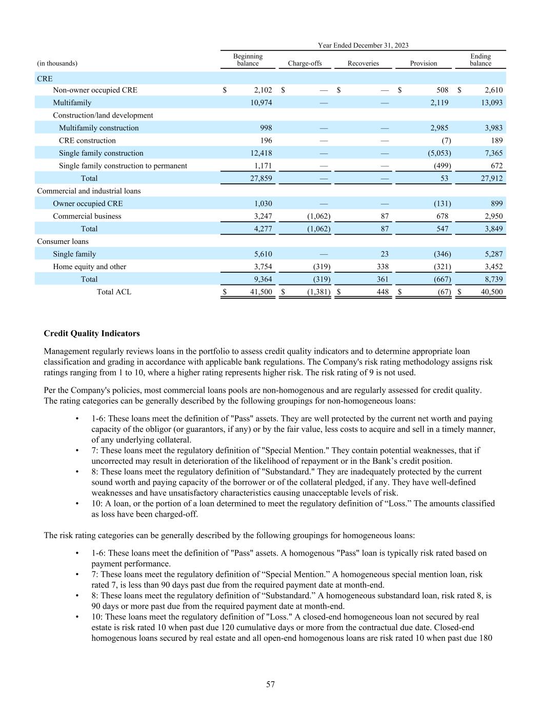 截至12月31日止年度,2023年(单位:千)期初余额冲销回收准备期末余额CRE非业主占用CRE $ 2,102 $ — $ — $ 508 $ 2,610多户家庭10,974 —— 2,11913,093建筑/土地开发多户家庭建筑998 —— 2,9853,983 CRE建筑196 ——(7)189单户家庭建筑12,418 ——(5,053)7,365单户家庭建筑至永久1,171 ——(499)672合计27,859 —— 5327,912商业和工业贷款所有者占用CRE 1,030 ——(131)899商业业务3,247(1,062)876782,950总计4,277(1,062)875473,849消费贷款单户5,610 — 23(346)5,287房屋净值和其他3,754(319)338(321)3,452总计9,364(319)361(667)8,739总计ACL $ 41,500 $(1,381)$ 448 $(67)$ 40,500信用质量指标管理层定期审查投资组合中的贷款,以评估信用质量指标,并根据适用的银行法规确定适当的贷款分类和评级。公司的风险评级方法分配1至10的风险评级,其中较高的评级代表较高的风险。不使用9的风险评级。根据该公司的政策,大多数商业贷款池是非同质的,并定期进行信用质量评估。对于非同质贷款,评级类别一般可以用以下分组来描述:• 1-6:这些贷款符合“通过”资产的定义。它们受到债务人(或担保人,如果有的话)当前净值和支付能力或任何基础抵押品的公允价值、较少及时收购和出售的成本的良好保护。• 7:这些贷款符合“特别提及”的监管定义。它们包含潜在的弱点,如果不加以纠正,可能会导致还款可能性恶化或银行的信用状况恶化。•8:这些贷款符合“次级”的监管定义。它们没有受到借款人或质押的抵押品(如果有的话)当前健全价值和支付能力的充分保护。它们有明确定义的弱点,并且具有不令人满意的特征,导致不可接受的风险水平。• 10:一笔贷款,或确定为符合“损失”监管定义的贷款部分。归类为损失的金额已被冲销。风险评级类别一般可以用同质贷款的以下分组来描述:• 1-6:这些贷款符合“通过”资产的定义。同质“及格”贷款通常是根据支付绩效进行风险评级。• 7:这些贷款符合“特别提及”的监管定义。同质关注类贷款,风险等级7,距月末规定缴款日逾期不足90天。•8:这些贷款符合“次级”的监管定义。同质次级贷款,风险等级8级,自月末规定的还款日起逾期90天或以上。• 10:这些贷款符合“损失”的监管定义。没有不动产担保的封闭式同质贷款,自合同约定到期日起逾期120天或以上,风险等级为10级。以房地产为抵押的封闭式同质贷款和所有开放式同质贷款逾期时风险评级为10级18057