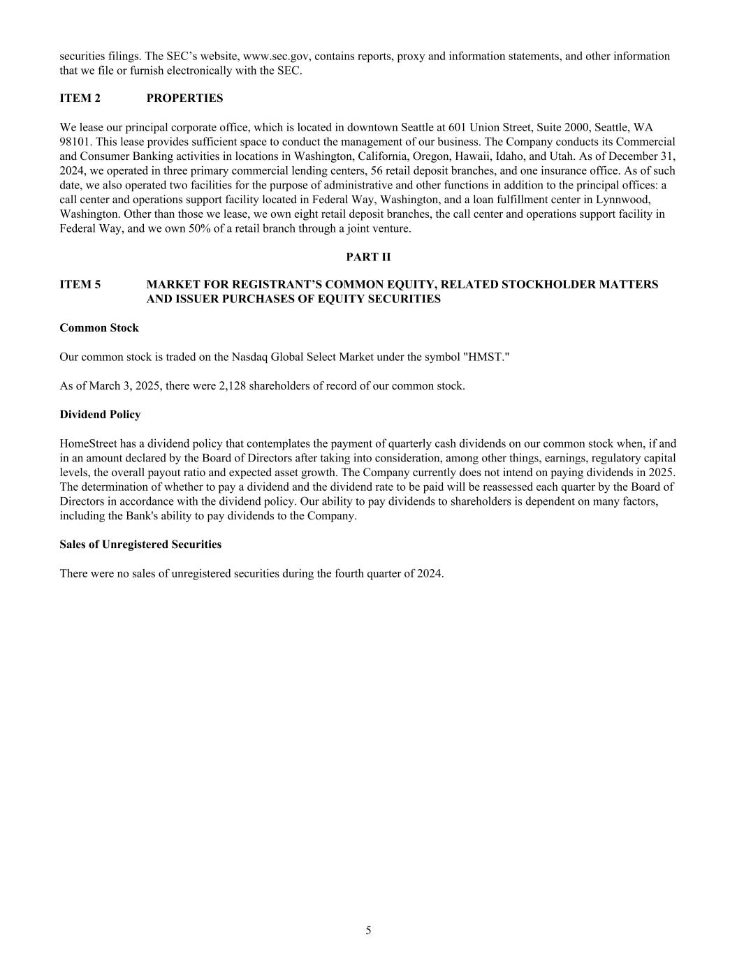 证券备案。SEC的网站www.sec.gov包含报告、代理和信息声明,以及我们以电子方式向SEC提交或提供的其他信息。项目2财产我们租用我们的主要公司办公室,该办公室位于西雅图市中心的601 Union Street,Suite 2000,Seattle,WA 98 101。这份租约提供了足够的空间来对我们的业务进行管理。该公司在华盛顿州、加利福尼亚州、俄勒冈州、夏威夷州、爱达荷州和犹他州开展商业和消费者银行业务。截至2024年12月31日,我们在三个一级商业贷款中心、56个零售存款分支机构和一个保险办事处开展业务。截至该日期,除了主要办公室外,我们还运营了两个用于行政和其他职能的设施:位于华盛顿州联邦路的呼叫中心和运营支持设施,以及位于华盛顿州林伍德的贷款履行中心。除了我们租赁的那些,我们拥有八个零售存款分支机构,联邦方式的呼叫中心和运营支持设施,我们通过合资企业拥有一个零售分支机构的50%。第二部分第5项注册人普通股、相关股东事项和发行人购买股票证券普通股的市场我们的普通股在纳斯达克全球精选市场交易,交易代码为“HMST”。截至2025年3月3日,我国普通股共有2128名在册股东。股息政策HomeStreet的股息政策设想在考虑(其中包括)收益、监管资本水平、整体派息率和预期资产增长后,在董事会宣布的情况下以及以董事会宣布的金额支付我们普通股的季度现金股息。公司目前不打算在2025年派发股息。董事会将根据股息政策,每季度重新评估是否支付股息和将支付的股息率的确定。我们向股东支付股息的能力取决于许多因素,包括银行向公司支付股息的能力。出售未登记证券2024年第四季度没有出售未登记证券。5