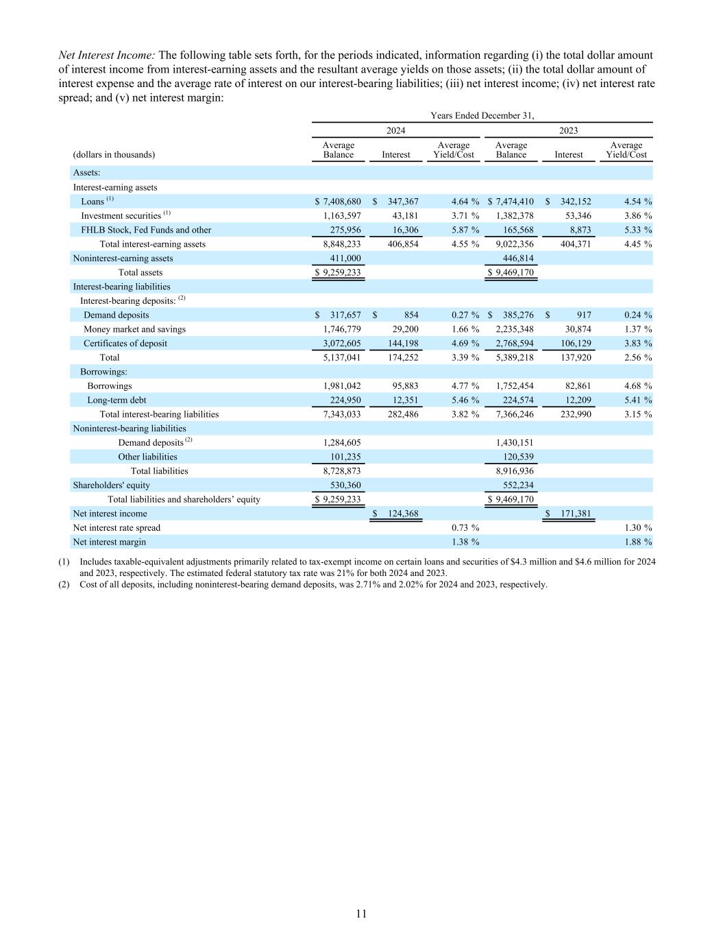 净利息收入:下表列出,就所示期间而言,有关(i)生息资产利息收入的总美元金额及这些资产的所得平均收益率;(ii)利息支出的总美元金额及我们计息负债的平均利率;(iii)净利息收入;(iv)净利差;及(v)净息差:截至12月31日止年度的资料,20242023(千美元)平均余额利息平均收益率/成本平均余额利息平均收益率/成本资产:生息资产贷款(1)$ 7,408,680 $ 347,3674.64% $ 7,474,410 $ 342,1524.54%投资证券(1)1,163,59743,1813.71% 1,382,37853,3463.86% FHLB股票,联邦基金及其他275,95616,3065.87% 165,5688,8735.33%生息资产总额8,848,233406,8544.55% 9,022,356404,3714.45%非生息资产411,000446,814总资产$ 9,259,233 $ 9,469,170计息负债计息存款:(2)活期存款$ 317,657 $ 8540.27% $ 385,276 $ 9170.24%货币市场和储蓄1,746,77929,2001.66% 2,235,34830,8741.37%存单3,072,605144,1984.69% 2,768,594106,1293.83%合计5,137,041174,2523.39% 5,389,218137,9202.56%借款:借款1,981,04295,8834.77% 1,752,45482,8614.68%长期债务224,95012,3515.46% 224,57412,2095.41%有息负债总额7,343,033282,4863.82% 7,366,246232,9903.15%无息负债活期存款(2)1,284,6051,430,151其他负债101,235120,539负债合计8,728,8738,916,936股东权益股东权益9,259,233美元9,469,170美元净利息收入124,368美元171,381美元净利差0.73% 1.30%净息差1.38% 1.88%(1)包括主要与2024年和2023年某些贷款和证券的免税收入相关的应税等值调整分别为430万美元和460万美元。预计2024年和2023年联邦法定税率均为21%。(2)包括无息活期存款在内的全部存款成本2024年和2023年分别为2.71%和2.02%。11