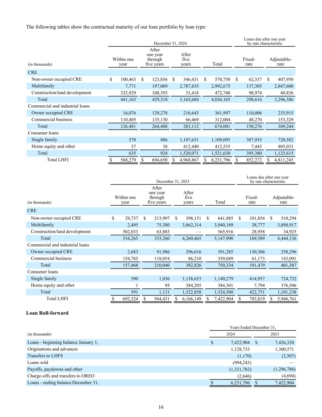 下表按贷款类型显示了我们贷款组合的合同期限:12月31日,2024年按利率特征分列的一年后到期的贷款(单位:千)一年后一年内至五年后五年固定利率可调整利率CRE非业主自用CRE总额100,463美元123,856美元346,431美元570,750美元62,337美元407,950美元多户家庭7,771197,0692,787,8352,992,675137,3052,847,600建筑/土地开发332,929108,39331,418472,74098,97440,836合计441,163429,3183,165,6844,036,165298,6163,296,386商业工业贷款业主占用CRE 16,076129,278216,643361,997110,006235,915商业业务110,405135,13066,469312,00448,270153,329合计126,481264,408283,112674,001158,276389,244消费贷款单户5788861,107,6311,109,095387,935720,582房屋净值及其他5738412,440412,5357,445405,033合计6359241,520,0711,521,630395,3801,125,615总LHFI $ 568,279 $ 694,650 $ 4,968,867 $ 6,231,796 $ 852,272 $ 42023年按利率特征分列的一年后到期的贷款(单位:千)一年后一年内至五年后五年固定利率可调整利率CRE非业主自用CRE总额29,737美元213,997美元398,151美元641,885美元101,854美元510,294多户家庭2,49575,3803,862,3143,940,18938,7773,898,917建筑/土地开发502,03363,883 — 565,91628,95834,925合计534,265353,2604,260,4655,147,990169,5894,444,136商业和工业贷款所有者占用CRE 2,68391,986296,616391,285130,306258,296商业业务154,785118,05486,210359,04961,173143,091合计157,468210,040382,826750,334191,479401,387消费贷款单一家庭5901,0361,138,6531,140,279414,957724,732房屋净值和其他195384,205384,3017,794376,506合计5911,1311,522,8581,524,580422,7511,101,238 LHFI $ 692,324 $ 564,431 $ 6,166,149 $ 7,422,904 $ 787,422,904美元7,426,320美元发起和垫款1,128,7331,300,571转入LHFS(1,170)(2,507)已售贷款(994,243)—付款、还款和其他(1,321,782)(1,296,786)冲销和转入OREO(2,646)(4,694)贷款-期末余额12月31日,6,231,796美元7,422,90416