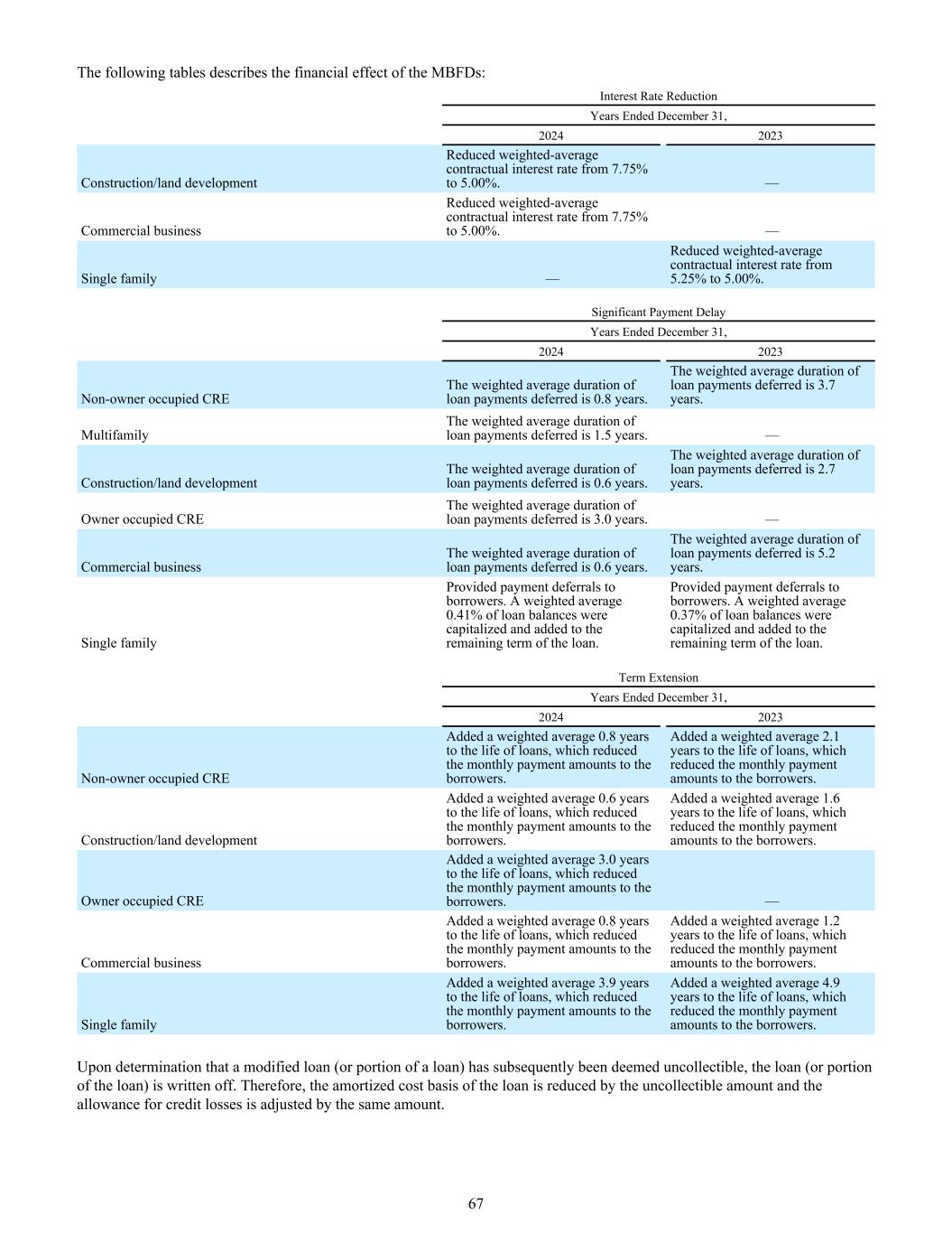 下表描述了MBFDs的财务影响:截至2024年12月31日的降息年份2023年建筑/土地开发的加权平均合同利率从7.75%降至5.00%。—商业业务将加权平均合同利率从7.75%降至5.00%。—单一家庭—将加权平均合同利率从5.25%降至5.00%。重大付款延迟截至2024年12月31日的年度2023年非业主自用CRE贷款付款延期的加权平均期限为0.8年。延期还本付息的加权平均期限为3.7年。多户家庭贷款延期支付的加权平均期限为1.5年。—建筑/土地开发延期支付贷款的加权平均期限为0.6年。延期支付贷款的加权平均期限为2.7年。业主自用CRE延期支付的贷款加权平均期限为3.0年。—商业性业务延期支付贷款的加权平均期限为0.6年。延期还本付息的加权平均期限为5.2年。单身家庭向借款人提供了延期付款。加权平均0.41%的贷款余额资本化,加入贷款剩余期限。向借款人提供了延期付款。加权平均0.37%的贷款余额予以资本化,加入贷款剩余期限。截至2024年12月31日的期限延长年2023年非自住CRE增加了加权平均0.8年的贷款期限,这减少了每月向借款人支付的金额。增加了加权平均2.1年的贷款期限,这减少了借款人的月还款额。建设/土地开发增加了加权平均0.6年的贷款期限,这减少了每月支付给借款人的金额。增加了加权平均1.6年的贷款期限,这减少了借款人的月还款额。业主自用CRE增加了加权平均3.0年的贷款期限,这减少了每月支付给借款人的金额。—商业业务新增加权平均0.8年贷款年限,降低了借款人的月供金额。增加了加权平均1.2年的贷款期限,这减少了借款人的月还款额。单身家庭增加了加权平均3.9年的贷款期限,这减少了借款人的月还款额。增加了加权平均4.9年的贷款期限,这减少了借款人的月还款额。一旦确定修改后的贷款(或贷款的一部分)随后被视为无法收回,则注销该贷款(或贷款的一部分)。因此,贷款的摊余成本基础减少了无法收回的金额,并调整了相同金额的信用损失准备金。67