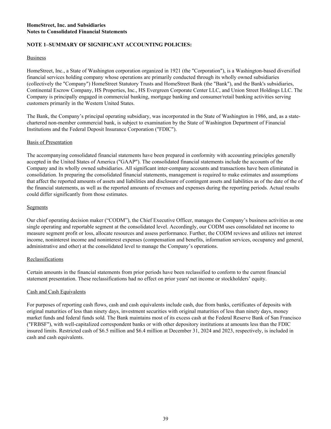 HomeStreet,Inc.和子公司的合并财务报表附注附注1 –重要会计政策摘要:Business HomeStreet,Inc.是一家成立于1921年的华盛顿州公司(“公司”),是一家总部位于华盛顿的多元化金融服务控股公司,其业务主要通过其全资子公司(统称“公司”)HomeStreet法定信托基金和HomeStreet银行(“银行”)以及该银行的子公司Continental Escrow Company、HS Properties,Inc.、HS Evergreen Corporate Center LLC和Union Street Holdings LLC进行。该公司主要从事商业银行、抵押贷款银行和消费者/零售银行业务,主要为美国西部的客户提供服务。该银行是公司的主要运营子公司,于1986年在华盛顿州注册成立,作为一家州特许非成员商业银行,接受华盛顿州金融机构部门和联邦存款保险公司(“FDIC”)的审查。列报基础随附的合并财务报表是按照美国普遍接受的会计原则(“GAAP”)编制的。合并财务报表包括本公司及其全资附属公司的账目。所有重要的公司间账户和交易已在合并中消除。在编制合并财务报表时,要求管理层作出估计和假设,这些估计和假设会影响截至财务报表日期的资产和负债的呈报金额以及或有资产和负债的披露,以及报告期内收入和支出的呈报金额。实际结果可能与这些估计有很大差异。分部我们的首席运营决策者(“CODM”),即首席执行官,在合并层面将公司的业务活动作为一个单一的运营和可报告分部进行管理。因此,我们的主要经营决策者使用综合净收入来衡量分部损益、分配资源和评估业绩。此外,主要经营决策者在合并层面审查和利用净利息收入、非利息收入和非利息支出(薪酬和福利、信息服务、占用和一般、行政和其他)来管理公司的运营。重新分类财务报表中以往各期的某些金额已重新分类,以符合当前的财务报表列报方式。这些重新分类对前几年的净收入或股东权益没有影响。现金和现金等价物就报告现金流量而言,现金和现金等价物包括现金、应收银行款项、原到期日少于九十天的存单、原到期日少于九十天的投资证券、货币市场基金和出售的联邦基金。该银行将大部分多余现金存放在旧金山联邦储备银行(“FRBSF”),存放在资本充足的代理行或其他存款机构,金额低于FDIC承保限额。2024年12月31日和2023年12月31日的限制性现金分别为650万美元和640万美元,计入现金和现金等价物。39