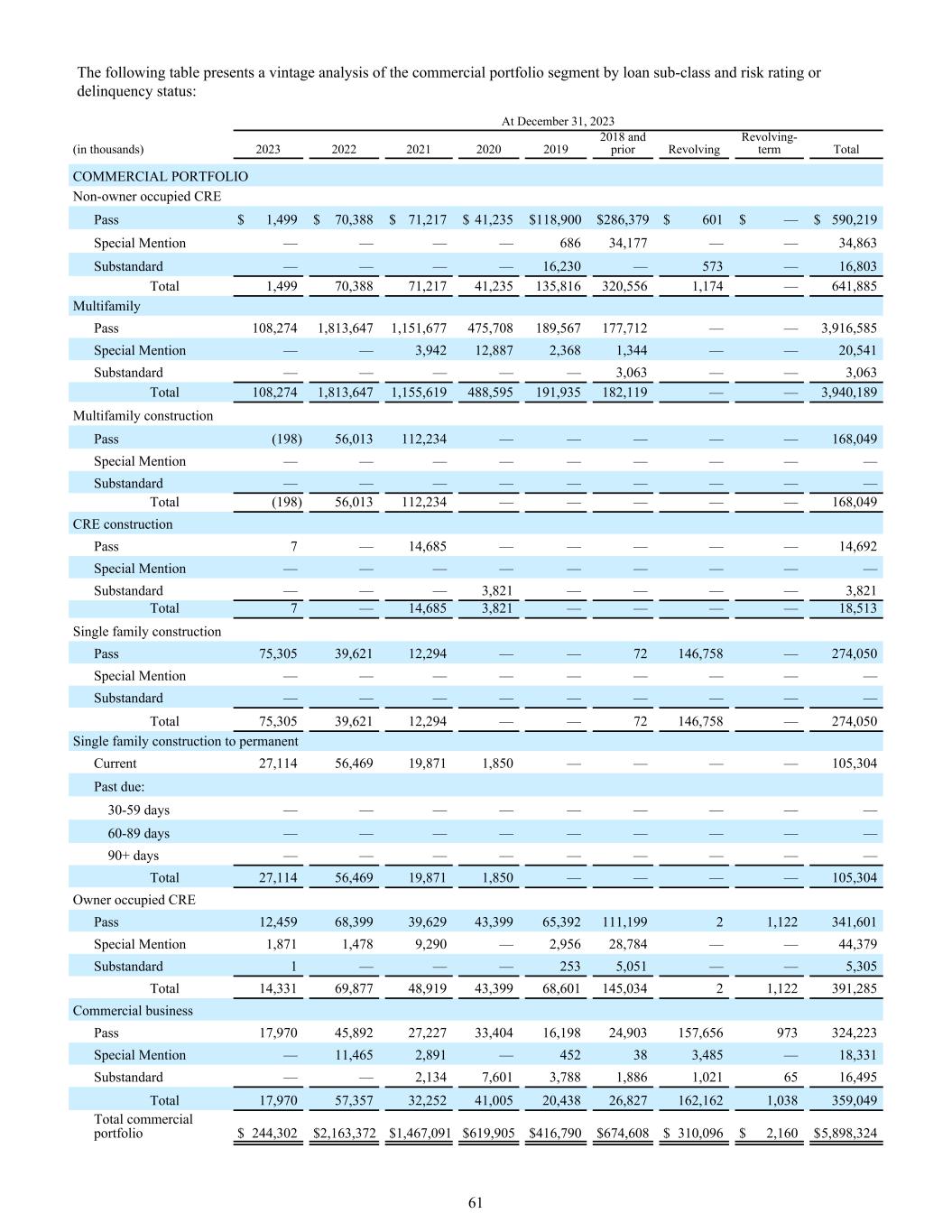 下表列出了按贷款子类划分的商业投资组合细分的年份分析和风险评级或拖欠状态:商业投资组合非业主占用CRE通票$ 1,499 $ 70,388 $ 71,217 $ 41,235 $ 118,900 $ 286,379 $ 601 $ — $ 590,219特别提款———— 68634,177 —— 34,863次标准———— 16,230 — 573 — 16,803合计1,49970,38871,21741,235135,816320,5561,174 — 641,885多户通票108,2741,813,6471,151,677475,708189,567177,712 —— 3,916,585特别提款—— 3,94212,8872,3681,344 —— 20,541次标准———— 3,063 —— 3,063合计108,2741,8多户建设通(198)56,013112,234 ———— 168,049特别提——————————不达标————————合计(198)56,013112,234 —————— 168,049 CRE建设通7 — 14,685 ———— 14,692特别提——————————不达标———— 3,821 ———— 3,821合计7 — 14,6853,821 ———— 18,513单户建设通75,30539,62112,294 —— 72146,758 — 274,050特别提及——————————不达标————————合计75,30539,62112,294 —— 72146,758 — 274,050单户建设至永久活期27,11456,46919,8711,850 ———— 105,304逾期:30-59天—————————— 60-89天———————— 90 +天————————合计27,11456,46919,8711,850 ———— 105,304业主占用CRE通12,45968,399399,62943,39965,392111,19921,122341,601特别提及额1,8711,4789,290 — 2,95628,784 —— 44,379次级标准1 ———— 2535,051 —— 5,305合计14,33169,87748,91943,39968,601145,03421,122391,285商业通票17,97045,89227,22733,40416,19824,903157,656973324,223特别提及额— 11,4652,891 — 452383,485 — 18,331次级标准—— 2,1347,6013,7881,8861,0216516,495合计17,97057,35732,25241,00520,43826,827162,1621,5,898,3242023年12月31日(单位:千)202320222021202020192018及以前循环循环-期限合计61