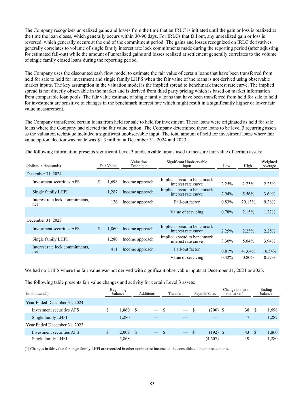 公司从发起IRLC开始确认未实现的损益,直到在贷款结束时实现损益,这通常发生在30-90天内。对于退出的IRLC,任何未实现的收益或损失都会被冲回,这通常发生在承诺期结束时。IRLC衍生工具上确认的损益一般与报告期间作出的单户利率锁定承诺的数量相关(经估计减损调整后),而结算时实现的未实现损益金额一般与报告期间单户已结清贷款的数量相关。公司使用贴现现金流模型,在不使用可观察的市场输入得出贷款公允价值的情况下,估计从持有待售转为持作投资和单户LHFS的某些贷款的公允价值。估值模型中的关键假设是隐含的对基准利率曲线的利差。隐含利差在市场上不能直接观察到,是根据可比贷款池的市场信息得出的第三方定价。从持有待售转为持作投资的单户贷款的公允价值估计对基准利率的变化很敏感,可能导致公允价值计量明显偏高或偏低。公司将若干贷款由持作出售转为持作投资。这些贷款产生于公司选择了公允价值选择权的持有待售贷款。公司确定这些贷款为第3级经常性资产,因为估值技术包括一项重大的不可观察投入。在2024年12月31日和2023年12月31日,为选择公允价值期权的投资贷款而持有的总金额为130万美元。以下信息呈现用于计量某些资产公允价值的重要的第3级不可观察输入值:(单位:千美元)公允价值估值技术重要的不可观察输入值低高加权平均2024年12月31日投资证券AFS 1,698美元收益法隐含对基准利率曲线的价差2.25% 2.25% 2.25%单户LHFI 1,287收益法隐含对基准利率曲线的价差2.94% 5.56% 3.69%利率锁定承诺,净126收益法Fall-out因子0.83% 29.13% 9.28%服务值0.78% 2.15% 1.37% 12月31日,2023投资证券AFS1,860美元收益法隐含对基准利率曲线的利差2.25% 2.25% 2.25%单户LHFI1,280收益法隐含对基准利率曲线的利差3.30% 5.04% 3.94%利率锁定承诺,净411收益法Fall-out因子0.81% 41.64% 10.54%服务价值0.32% 0.80% 0.57%我们在2024年12月31日或2023年没有公允价值未通过重大可观察输入值得出的LHFS。下表列出了某些第3级资产的公允价值变动和活动:(单位:千)期初余额增加转移收益/销售额按市值变动(1)截至2024年12月31日的期末余额年度投资证券AFS $ 1,860 $ — $ — $(200)$ 38 $ 1,698单户LHFI 1,280 ———— 7截至12月31日的年度1,287,2023投资证券AFS $ 2,009 $ — $ — $(192)$ 43 $ 1,860单户LHFI 5,868 ——(4,607)191,280(1)单户LHFI的公允价值变动在综合损益表的其他非利息收入中记录。83