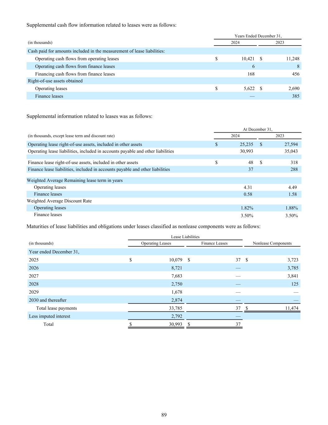 与租赁相关的补充现金流量信息如下:截至12月31日止年度,(单位:千)20242023为计入租赁负债计量的金额支付的现金:经营租赁产生的经营现金流量10,421美元11,248美元融资租赁产生的经营现金流量68融资租赁产生的融资现金流量168456获得的使用权资产经营租赁5622美元2690美元融资租赁— 385与租赁相关的补充信息如下:截至12月31日,(单位:千,租赁期和贴现率除外)20242023经营租赁使用权资产,计入其他资产25235美元27594美元经营租赁负债,计入应付账款和其他负债3099335043融资租赁使用权资产,计入其他资产48美元318美元融资租赁负债,计入应付账款和其他负债37288加权平均剩余租赁期各年经营租赁4.31 4.49融资租赁0.58 1.58加权平均贴现率经营租赁1.82% 1.88%融资租赁3.50% 3.50%租赁负债和分类为非租赁部分的租赁项下义务到期情况如下:租赁负债(单位:千)经营租赁融资租赁非租赁部分截至12月31日止年度,2025年10079美元37美元372320268,721 — 378520277,683 — 384120282,750 — 12520291,678 —— 2030年及其后2,874 ——租赁付款总额33,78537美元11,474减去推算利息2,792 ——总额30,993美元3789