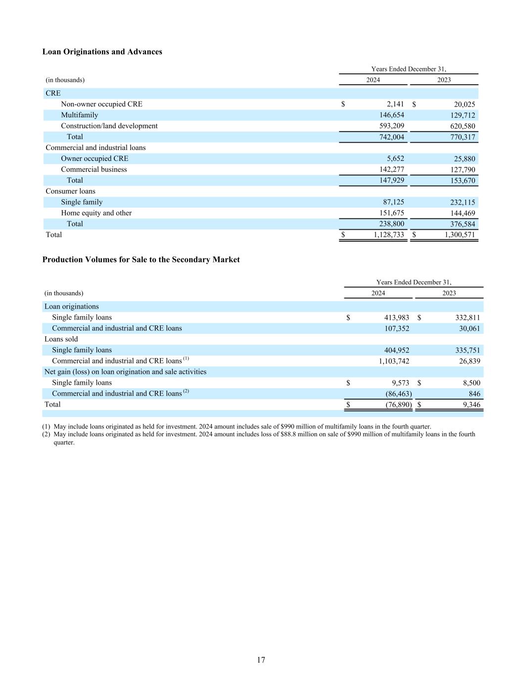 截至12月31日的贷款发放和垫款年度,(单位:千)20242023 CRE非业主占用CRE $ 2,141 $ 20,025多户家庭146,654129,712建筑/土地开发593,209620,580总计742,004770,317商业和工业贷款业主占用CRE 5,65225,880商业业务142,277127,790总计147,929153,670消费贷款单一家庭87,125232,115房屋净值和其他151,675144,469总计238,800376,584总计1,128,733美元1,300,571生产量出售给二级市场截至12月31日的年度,(单位:千)20242023贷款发起单户贷款$ 413,983 $ 332,811商业和工业及CRE贷款107,35230,061已售贷款单户贷款404,952335,751商业和工业及CRE贷款(1)1,103,74226,839贷款发起和销售活动净收益(损失)单户贷款$ 9,573 $ 8,500商业和工业及CRE贷款(2)(86,463)846总计$(76,890)$ 9,346(1)可能包括为投资而产生的贷款。2024年金额包括在第四季度出售9.9亿美元的多户家庭贷款。(2)可能包括作为为投资而持有而产生的贷款。2024年金额包括第四季度出售9.9亿美元多户家庭贷款的8880万美元损失。17