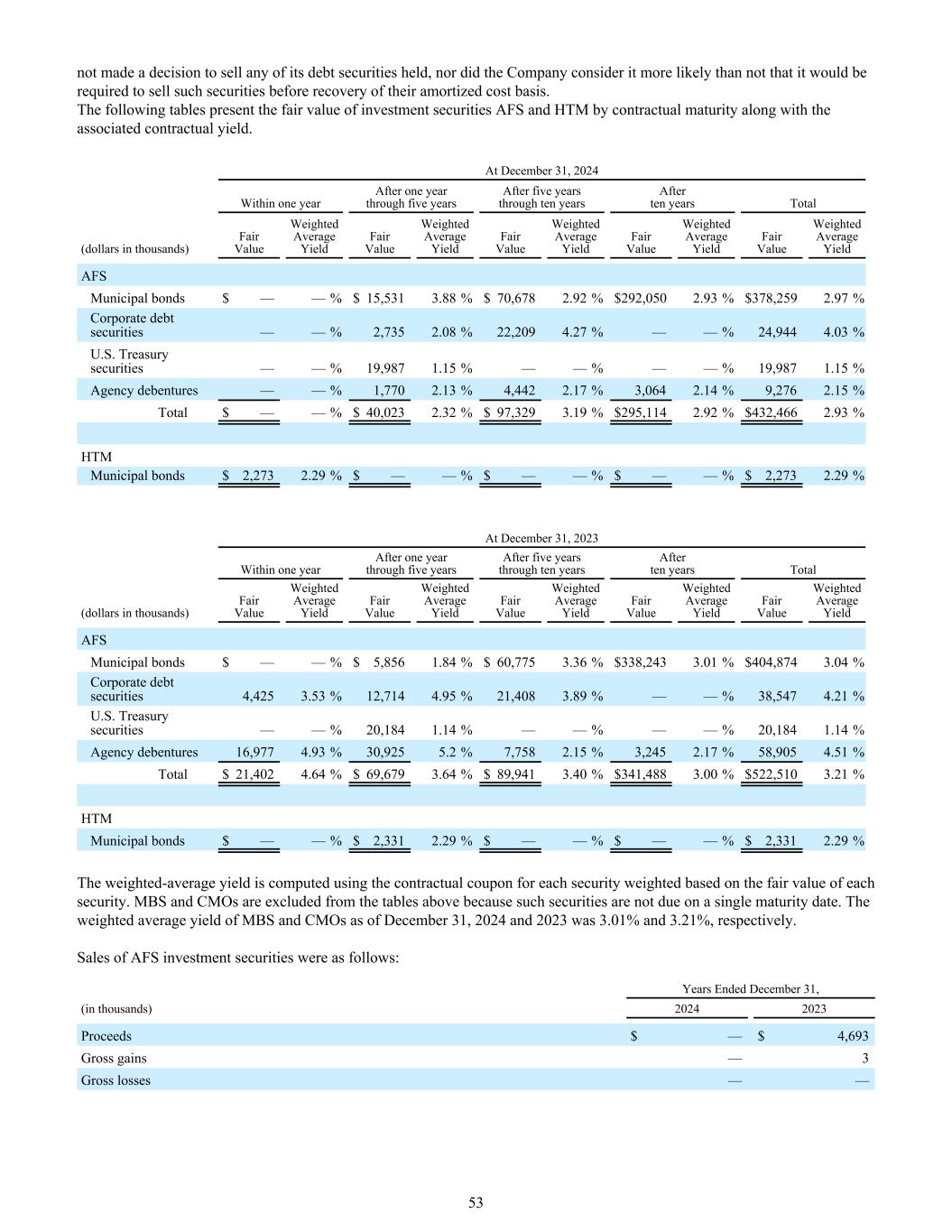 没有作出出售其持有的任何债务证券的决定,公司也不认为很有可能需要在收回其摊余成本基础之前出售此类证券。下表按合同期限列出投资证券AFS和HTM的公允价值以及相关的合同收益率。12月31日,2024一年后一年内五年后五年内十年后十年内合计(千美元)公允价值加权平均收益率公允价值加权平均收益率公允价值加权平均收益率公允价值加权平均收益率公允价值加权平均收益率公允价值加权平均收益率AFS市政债券$ ——% $ 15,5313.88% $ 70,6782.92% $ 292,0502.93% $ 378,2592.97%公司债务证券——% 2,7352.08% 22,2094.27% ——% 24,9444.03%美国国债——% 19,9871.15% ——% ——% 19,9871.15%机构债券——% 1,7702.13% 4,4422.17% 3,0642.14% 9,2762.15%合计$ ——% $ 40,0232.32% $ 97,3293.19% $ 295,1142.92% $ 432,466 2.93% HTM市政债券$ 2,2732.29% $ ——% $ ——% $ ——% $ 2,2732.29%截至12月31日,2023一年后一年内五年后五年内十年后十年内合计(千美元)公允价值加权平均收益率公允价值加权平均收益率公允价值加权平均收益率公允价值加权平均收益率公允价值加权平均收益率公允价值加权平均收益率AFS市政债券$ ——% $ 5,8561.84% $ 60,7753.36% $ 338,2433.01% $ 404,8743.04%公司债务证券4,4253.53% 12,7144.95% 21,4083.89% ——% 38,5474.21%美国国债——% 20,1841.14% ——% ——% 20,1841.14%机构债券16,9774.93% 30,9255.2% 7,758 2.15% 3,2452.17% 58,9054.51%总计$ 21,4024.64% $ 69,6793.64% $ 89,9413.40% $ 341,4883.00% $ 522,5103.21% HTM市政债券$ ——% $ 2,3312.29% $ 2,3312.29%加权平均收益率使用根据每份证券的公允价值加权的每份证券的合同票息计算。MBS和CMO被排除在上表之外,因为这类证券并非在单一到期日到期。截至2024年12月31日和2023年12月31日,MBS和CMO的加权平均收益率分别为3.01%和3.21%。AFS投资证券销售情况如下:截至12月31日止年度,(单位:千)20242023收益$ — $ 4,693毛收益— 3毛亏损—— 53