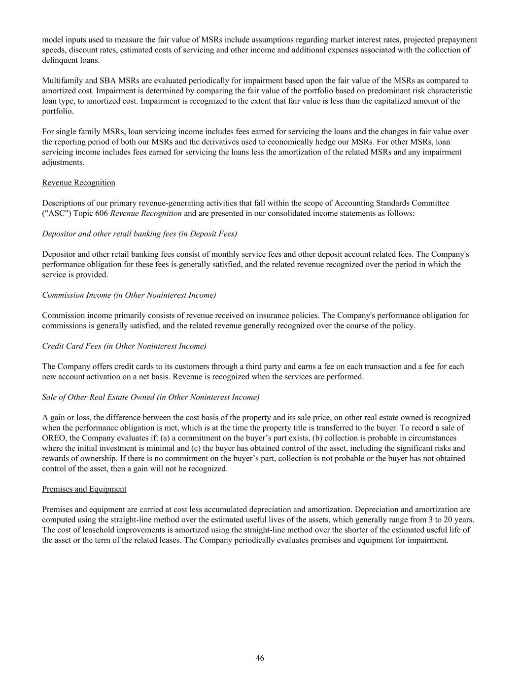 用于计量MSR公允价值的模型输入包括有关市场利率、预计提前还款速度、贴现率、估计的服务成本和其他收入以及与收取拖欠贷款相关的额外费用的假设。Multifamily和SBA MSR定期根据MSR的公允价值与摊余成本进行减值评估。减值是通过比较基于主要风险特征贷款类型的组合公允价值,以摊余成本确定的。减值在公允价值低于投资组合资本化金额的范围内确认。对于单一家庭MSR,贷款服务收入包括为贷款提供服务所赚取的费用以及我们的MSR和用于对冲我们的MSR的衍生工具在报告期内的公允价值变动。对于其他MSR,贷款服务收入包括为贷款服务赚取的费用减去相关MSR的摊销和任何减值调整。收入确认我们属于会计准则委员会(“ASC”)主题606收入确认范围并在我们的综合损益表中列报的主要创收活动的说明如下:存款人和其他零售银行费用(在存款费用中)存款人和其他零售银行费用包括每月服务费和其他存款账户相关费用。公司对这些费用的履约义务一般得到履行,并在提供服务的期间内确认相关收入。佣金收入(其他非利息收入)佣金收入主要包括收到的保单收入。公司对佣金的履约义务一般得到满足,相关收入一般在保单存续期间确认。信用卡费用(在其他非利息收入中)公司通过第三方向其客户提供信用卡,并在每笔交易中赚取费用,并在净额基础上赚取每笔新账户激活的费用。收入在提供服务时确认。出售所拥有的其他不动产(在其他非利息收入中)对所拥有的其他不动产的收益或损失,即该财产的成本基础与其出售价格之间的差额,在履约义务得到履行时确认,即在该财产所有权转移给买受人时确认。为记录奥利奥的销售,公司评估以下情况:(a)买方方面存在承诺,(b)在初始投资极少的情况下很可能收款,以及(c)买方已获得资产的控制权,包括所有权的重大风险和回报。如果买受人方面没有承诺、不可能收款或买受人未取得资产控制权,则不确认收益。房地及设备房地及设备按成本减累计折旧及摊销列账。折旧和摊销按资产的预计使用寿命采用直线法计算,一般为3年至20年。租赁物改良成本采用直线法按资产的预计使用寿命或相关租赁期限两者中较短者摊销。公司定期对房地和设备进行减值评估。46