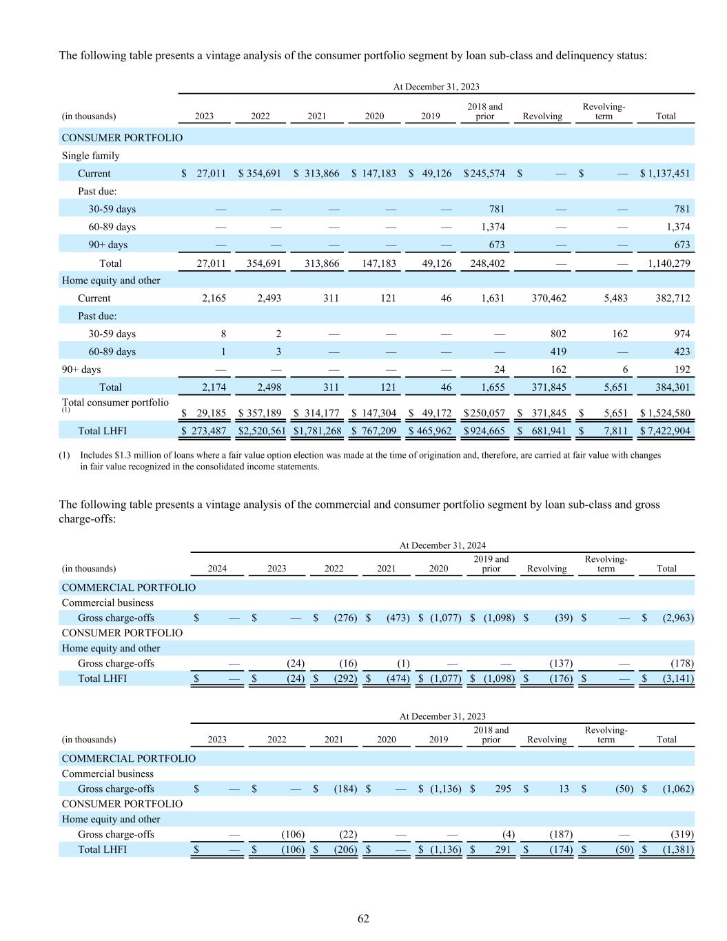 下表按贷款子类别和拖欠状况对消费者投资组合部分进行了年份分析:截至12月31日,2023(单位:千)202320222021202020192018和以前的循环周期总消费者组合单一家庭当前27,011美元354,691美元313,866美元147,183美元49,126美元245,574美元— 1,137,451美元逾期:30-59天—————— 781 —— 781 60-89天———— 1,374 —— 1,37490 +天———— 673 —— 673合计27,011354,691313,866147,18349,126248,402 —— 1,140,279房屋净值及其他往来款2,1652,493311121461,631370,4625,483382,712逾期:30-59天82 ———— 802162974 60-89天13 ———— 419 — 42390 +天———— 241626192合计2,1742,498311121461,655371,8455,651384,301消费者组合总额(1)$ 29,185 $ 357,189 $ 314,177 $ 147,304 $ 49,172 $ 250,057 $ 371,845 $ 5,651 $ 1,524,580 LHFI合计$ 273,487 $ 2,520,561 $ 1,781,268 $ 767,209 $ 465,962 $ 924,665 $ 681,941 $ 7,811 $包括在发起时作出公允价值选择的130万美元贷款,因此按公允价值列账,公允价值变动在综合损益表中确认。下表按贷款子类和毛冲销对商业和消费者投资组合部分进行了年份分析:截至12月31日,2024(千)202420232022202120202019和以前的循环周期总商业投资组合商业业务毛冲销$ — $ — $(276)$(473)$(1077)$(1098)$(39)$ — $(2963)消费者投资组合房屋净值和其他毛冲销——(24)(16)(1)——(137)——(178)总LHFI $ — $(24)$(292)$(474)$(1077)$(1098)$(176)$ — $(3141)截至12月31日,2023(千)202320222021202020192018和以前的循环周期总商业投资组合商业业务毛冲销$ — $ — $(184)$ — $(1,136)$ 295 $ 13 $(50)$(1,062)消费者投资组合房屋净值和其他毛冲销——(106)(22)——(4)(187)——(319)总LHFI $ — $(106)$(206)$ — $(1,136)$ 291 $(174)$(50)$(1,381)62