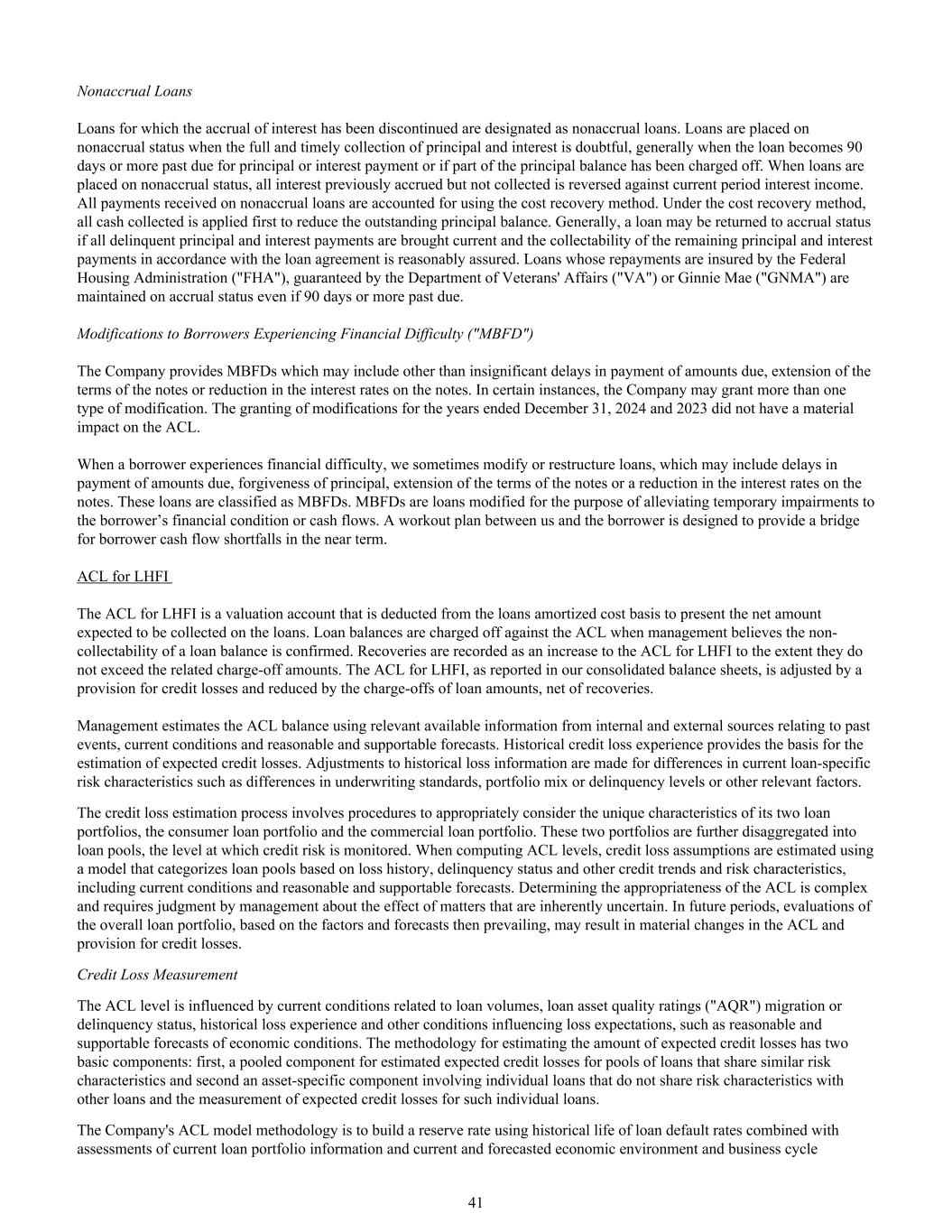 已停止计提利息的非应计贷款贷款被指定为非应计贷款。当全额及时收回本金和利息存疑时,贷款被置于非应计状态,一般是当贷款逾期90天或更长时间支付本金或利息或部分本金余额已被冲销时。当贷款被置于非应计状态时,之前应计但未收取的所有利息将冲回当期利息收入。就非应计贷款收到的所有付款均采用成本回收法入账。在成本回收法下,先应用所有已收回的现金,以减少未偿本金余额。通常,如果所有拖欠的本金和利息付款都是当期的,并且根据贷款协议合理保证了剩余本金和利息付款的可收回性,则贷款可能会恢复到应计状态。其还款由联邦住房管理局(“FHA”)提供保险、由退伍军人事务部(“VA”)或Ginnie Mae(“GNMA”)提供担保的贷款,即使逾期90天或更长时间,也将保持应计状态。对遇到财务困难(“MBFD”)的借款人的修改公司提供的MBFD可能包括到期金额的不重大延迟支付、票据条款的延长或票据利率的降低以外的其他内容。在某些情况下,公司可能会授予不止一种类型的修改。授予截至2024年12月31日和2023年12月31日止年度的修改对ACL没有实质性影响。当借款人遇到财务困难时,我们有时会修改或重组贷款,这可能包括延迟支付到期金额、免除本金、延长票据条款或降低票据利率。这些贷款被归类为MBFD。MBFD是为减轻借款人财务状况或现金流的暂时性减值而修改的贷款。我们与借款人之间的一项锻炼计划旨在为近期内借款人的现金流短缺提供一个桥梁。ACL for LHFI The ACL for LHFI is a valuation account that deducts from the loan amortized cost basis to present the net amount expected to be collected on the loan。当管理层认为贷款余额的不可收回性得到确认时,贷款余额将从ACL中扣除。回收记录为LHFI的ACL增加,但不超过相关的冲销金额。正如我们在综合资产负债表中报告的那样,LHFI的ACL由信贷损失准备金调整,并由贷款金额的冲销(扣除回收)减少。管理层使用来自内部和外部来源的有关过去事件、当前状况以及合理和可支持的预测的相关可用信息来估计ACL余额。历史信用损失经验为预期信用损失的估算提供了依据。针对当前特定贷款风险特征的差异,例如承保标准、投资组合组合或拖欠水平的差异或其他相关因素,对历史损失信息进行调整。信用损失估算过程涉及适当考虑其两个贷款组合——消费者贷款组合和商业贷款组合的独特特征的程序。这两个投资组合被进一步分解为贷款池,即信用风险被监测的水平。在计算ACL水平时,信用损失假设是使用一个模型进行估计的,该模型根据损失历史、拖欠状况和其他信用趋势和风险特征(包括当前状况和合理且可支持的预测)对贷款池进行分类。确定ACL的适当性是复杂的,需要管理层对本质上不确定的事项的效果进行判断。在未来期间,根据当时普遍存在的因素和预测对总体贷款组合进行评估,可能会导致ACL和信贷损失准备金发生重大变化。信用损失计量ACL水平受到与贷款量、贷款资产质量评级(“AQR”)迁移或拖欠状态、历史损失经验和其他影响损失预期的条件相关的当前条件的影响,例如对经济状况的合理和可支持的预测。预期信用损失金额的估算方法有两个基本组成部分:第一, 具有类似风险特征的贷款池的估计预期信贷损失的集合部分,以及涉及不与其他贷款具有共同风险特征的个别贷款的特定资产部分,以及此类个别贷款的预期信贷损失计量。该公司的ACL模型方法是利用贷款违约率的历史寿命并结合对当前贷款组合信息以及当前和预测的经济环境和商业周期的评估来构建一个准备金率41