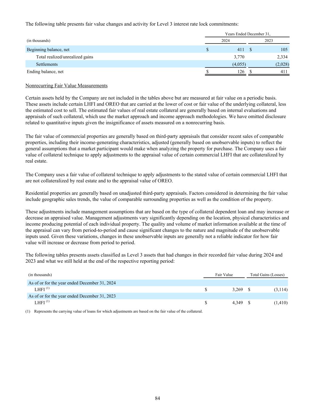 下表列出了第3级利率锁定承诺的公允价值变动和活动:截至12月31日的年度,(单位:千)20242023年期初余额,净额411美元105美元已实现/未实现收益总额3,7702,334结算(4,055)(2,028)期末余额,净额126美元411美元非经常性公允价值计量公司持有的某些资产不包括在上表中,而是定期以公允价值计量。这些资产包括某些LHFI和OREO,它们以基础抵押品的成本或公允价值中的较低者列账,减去估计的出售成本。房地产抵押品的估计公允价值一般基于对这类抵押品的内部评估和评估,采用市场法和收益法方法。鉴于以非经常性为基础计量的资产并不重要,我们省略了与定量输入相关的披露。商业物业的公允价值通常基于第三方评估,这些评估考虑了可比物业的近期销售情况,包括其创收特征,并进行了调整(通常基于不可观察的投入),以反映市场参与者在分析所购买的物业时所作的一般假设。公司采用公允价值抵押物技术,对以不动产作抵押的某些商业LHFI的评估价值进行调整。公司采用公允价值抵押技术,对不以房地产作抵押的某些商业LHFI的规定价值和OREO的评估价值进行调整。住宅物业一般以未经调整的第三方评估为依据。在确定公允价值时考虑的因素包括地理销售趋势、周边可比物业的价值以及物业的状况。这些调整包括管理层的假设,这些假设是基于抵押品依赖贷款的类型,可能会增加或减少一个评估价值。根据每个单独物业的位置、物理特征和创收潜力,管理调整差异很大。评估时可获得的市场信息的质量和数量可能因时期而异,并导致所使用的不可观察投入的性质和规模发生重大变化。鉴于这些差异,这些不可观察输入值的变化通常不是公允价值将如何在不同时期增加或减少的可靠指标。下表列出了分类为第3级资产的资产,这些资产在2024年和2023年期间记录的公允价值发生了变化,以及我们在相应报告期末仍持有的资产:(单位:千)截至2024年12月31日止年度或截至2024年12月31日止年度的公允价值总收益(损失)LHFI(1)$ 3,269 $(3,114)截至2023年12月31日止年度或截至2023年12月31日止年度LHFI(1)$ 4,349 $(1,410)(1)表示根据抵押品的公允价值进行调整的贷款的账面价值。84