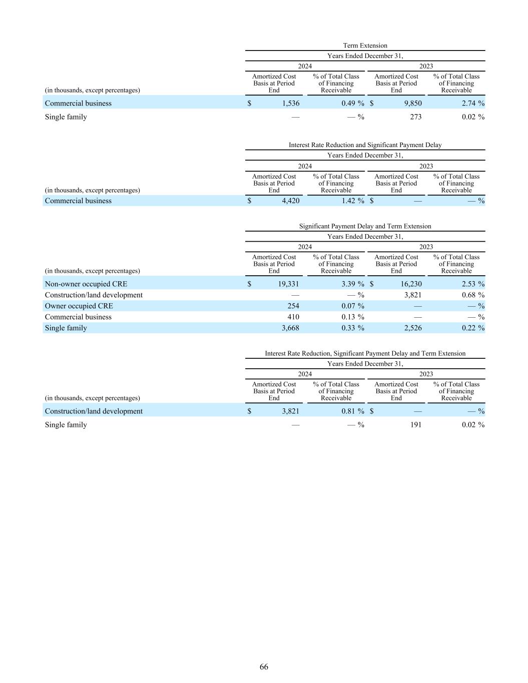 截至2024年12月31日的期限延长年份2023年(单位:千,百分比除外)期末摊余成本基率%应收融资总类别期末摊余成本基率%应收融资总类别商业业务$ 1,5360.49% $ 9,8502.74%单一家庭——% 2730.02%利率降低和重大付款延迟年份截至2024年12月31日2023年(单位:千,除百分比外)期末摊余成本基差%应收融资类总额期末摊余成本基差%应收融资类总额商业业务$ 4,4201.42% $ —— %截至2024年12月31日的重大付款延迟和期限延长年份2023(单位:千,除百分比外)期末摊余成本基差%应收融资类总额期末摊余成本基差%应收融资类总额非业主占用CRE $ 19,3313.39% $ 16,2302.53%建筑/土地开发——% 3,8210.68%业主占用CRE 2540.07% ——%商业业务4100.13% ——%单户3,668 0.33% 2,5260.22%利率下调、重大付款延迟和期限延长截至2024年12月31日的年份2023(单位:千,除百分比外)期末摊余成本基差%应收融资总类期末摊余成本基差%应收融资总类建筑/土地开发$ 3,82 10.81% $ ——%单户——% 1910.02% 66