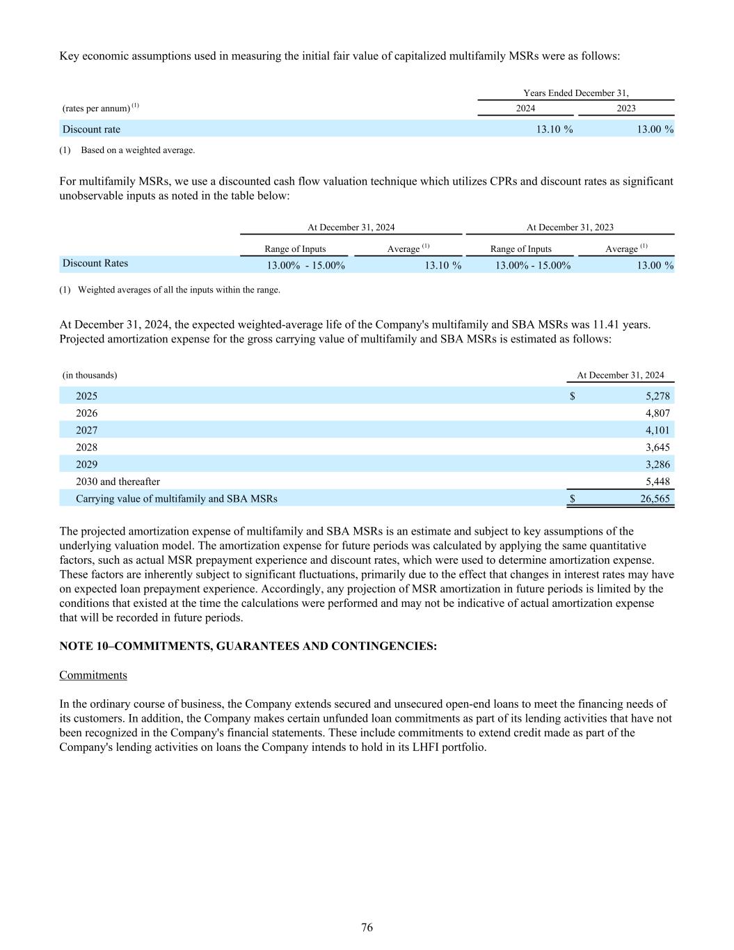 用于计量资本化多户MSR初始公允价值的关键经济假设如下:截至12月31日止年度,(年利率)(1)20242023贴现率13.10% 13.00%(1)基于加权平均。对于多家族MSR,我们使用贴现现金流估值技术,该技术利用CPR和贴现率作为重要的不可观察输入值,如下表所示:2024年12月31日2023年12月31日输入范围平均值(1)输入范围平均值(1)贴现率13.00%-15.00% 13.10% 13.00%-15.00% 13.00%(1)范围内所有输入的加权平均值。截至2024年12月31日,公司多户家庭和SBA MSR的预期加权平均寿命为11.41年。多户家庭和SBA MSR账面总值的预计摊销费用估计如下:(单位:千)截至2024年12月31日20255,27820264,80720274,10120283,64520293,2862030及其后5,448多户家庭和SBA MSR的账面价值26,565美元多户家庭和SBA MSR的预计摊销费用是一项估计,并取决于基础估值模型的关键假设。未来期间的摊销费用采用相同的数量因素计算,如实际MSR提前还款经验和贴现率,用于确定摊销费用。这些因素在本质上会受到显着波动,主要是由于利率变化可能对预期贷款提前还款体验产生的影响。因此,对未来期间MSR摊销的任何预测都受到进行计算时存在的条件的限制,可能并不表明将在未来期间记录的实际摊销费用。注10 –承诺、保证和或有事项:承诺在日常业务过程中,公司提供有担保和无担保的开放式贷款,以满足客户的融资需求。此外,公司作出某些未提供资金的贷款承诺,作为其贷款活动的一部分,这些承诺未在公司财务报表中确认。其中包括作为公司贷款活动的一部分对公司打算在其LHFI投资组合中持有的贷款作出的提供信贷的承诺。76