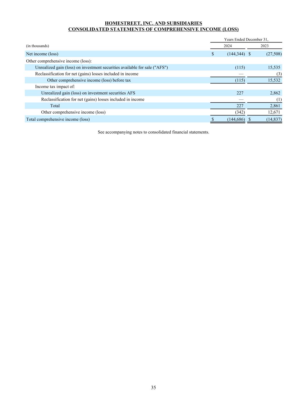 Homestreet, Inc.及附属公司截至12月31日的综合收入(亏损)年度综合报表,(单位:千)20242023净收益(亏损)$(144,344)$(27,508)其他综合收益(亏损):可供出售投资证券的未实现收益(亏损)(“AFS”)(115)15,535重分类计入收益的净(收益)亏损——(3)税前其他综合收益(亏损)(115)15,532所得税影响:投资证券的未实现收益(亏损)AFS 227,862重分类计入收益的净(收益)亏损——(1)合计2272,861其他综合收益(亏损)(342)12,671综合收益总额(亏损)$(144,686)$(14,837)见合并财务报表附注。35