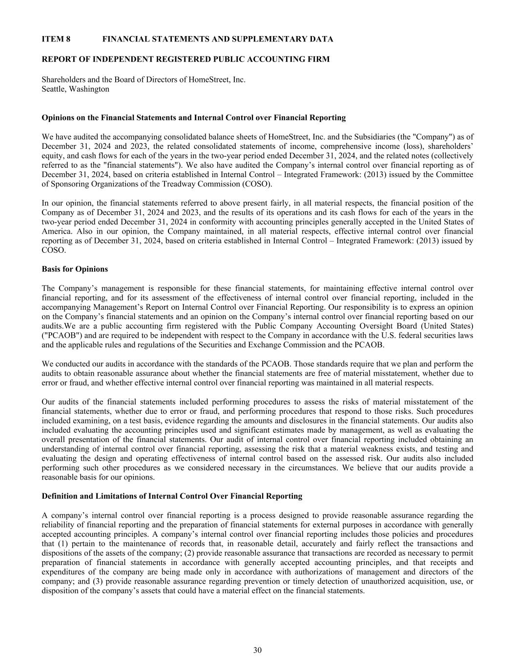 项目8独立注册公共会计公司股东的财务报表和补充数据报告以及HomeStreet,Inc. Seattle,Washington的董事会关于财务报表和财务报告内部控制的意见我们审计了所附的丨HomeStreet丨HomeStreet,Inc.及其子公司(“公司”)截至2024年12月31日和2023年12月31日和截至2024年12月31日止两年期间各年度的相关合并资产负债表、综合收益(亏损)、股东权益、现金流量表及相关附注(统称“财务报表”)。我们还根据Treadway Commission(COSOO)发起组织委员会发布的《内部控制– Integrated Framework:(2013)》中确立的标准,对公司截至2024年12月31日的财务报告内部控制进行了审计。我们认为,上述财务报表按照美利坚合众国普遍接受的会计原则,在所有重大方面公允反映了公司截至2024年12月31日和2023年12月31日的财务状况,以及截至2024年12月31日的两年期间各年度的经营业绩和现金流量。我们还认为,截至2024年12月31日,公司根据COSOO发布的《内部控制–综合框架:(2013)》中确立的标准,在所有重大方面保持了对财务报告的有效内部控制。意见的依据公司管理层对这些财务报表负责,对维持有效的财务报告内部控制负责,并对其财务报告内部控制有效性进行评估,包括在随附的管理层财务报告内部控制报告中。我们的责任是根据我们的审计对公司的财务报表和公司的财务报告内部控制发表意见。我们是在美国上市公司会计监督委员会(“PCAOB”)注册的公共会计师事务所,根据美国联邦证券法以及美国证券交易委员会和PCAOB的适用规则和条例,我们被要求对公司具有独立性。我们按照PCAOB的标准进行了审计。这些准则要求我们计划和执行审计,以就财务报表是否不存在重大错报、是否由于错误或欺诈以及是否在所有重大方面保持了有效的财务报告内部控制取得合理保证。我们对财务报表的审计包括执行程序以评估财务报表的重大错报风险,无论是由于错误还是欺诈,并执行应对这些风险的程序。这些程序包括在测试的基础上审查有关财务报表中的数额和披露的证据。我们的审计还包括评估管理层使用的会计原则和作出的重大估计,以及评估财务报表的总体列报方式。我们对财务报告内部控制的审计包括了解财务报告内部控制,评估存在重大缺陷的风险,并根据评估的风险对内部控制的设计和运行有效性进行测试和评估。我们的审计还包括执行我们认为在当时情况下必要的其他程序。我们认为,我们的审计为我们的意见提供了合理的基础。财务报告内部控制的定义和限制公司的财务报告内部控制是一个旨在为财务报告的可靠性和根据公认会计原则为外部目的编制财务报表提供合理保证的过程。公司对财务报告的内部控制包括:(1)与维护记录有关的政策和程序,这些记录以合理的细节准确和公平地反映公司资产的交易和处置;(2)提供合理保证,交易记录是必要的,以允许按照公认会计原则编制财务报表,并且公司的收支仅根据公司管理层和董事的授权进行;以及(3)就防止或及时发现未经授权的获取、使用、 或处置可能对财务报表产生重大影响的公司资产。30