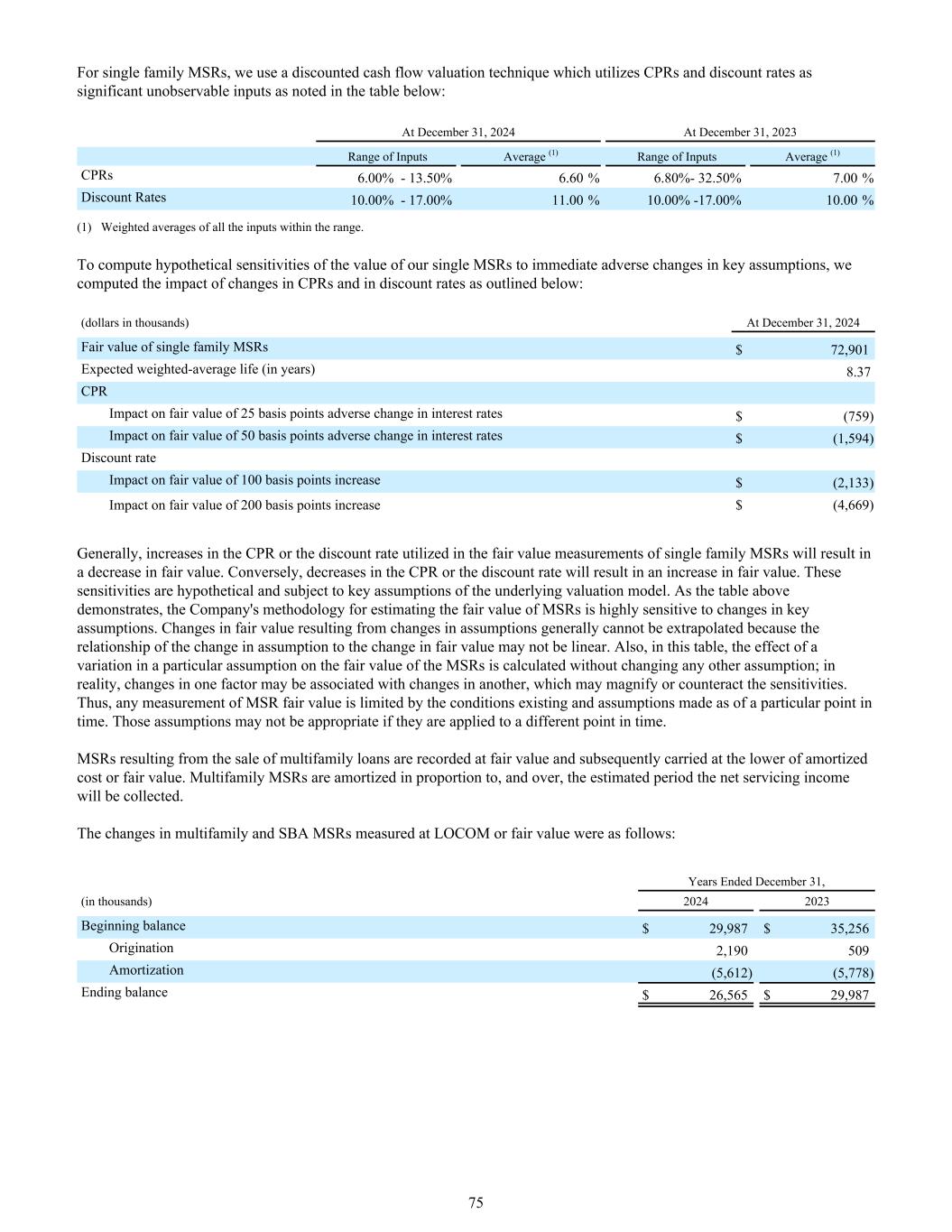 对于单户MSR,我们使用贴现现金流估值技术,该技术利用CPRs和贴现率作为重要的不可观察输入值,如下表所示:2024年12月31日2023年12月31日输入范围平均值(1)输入范围平均值(1)CPRs 6.00%-13.50% 6.60% 6.80%-32.50% 7.00%贴现率10.5%-17.00% 11.00% 10.5%-17.00 % 10.5%(1)范围内所有输入值的加权平均值。为了计算我们的单一MSR价值对关键假设的即时不利变化的假设敏感性,我们计算了CPR和贴现率变化的影响,概述如下:(单位:千美元)截至12月31日,2024年单户MSR公允价值72,901美元预期加权平均寿命(年)8.37 CPR对公允价值的影响25个基点利率不利变化$(759)对公允价值的影响50个基点利率不利变化$(1,594)贴现率对公允价值的影响100个基点增加$(2,133)对公允价值的影响200个基点增加$(4,669)一般来说,CPR或单户MSR公允价值计量中使用的贴现率的增加将导致公允价值的下降。反之,CPR或贴现率的下降将导致公允价值的增加。这些敏感性是假设性的,并受制于基础估值模型的关键假设。如上表所示,公司估计MSR公允价值的方法对关键假设的变化高度敏感。假设变动导致的公允价值变动一般不能外推,因为假设变动与公允价值变动的关系可能不是线性的。此外,在本表中,计算特定假设的变化对MSR公允价值的影响时不改变任何其他假设;实际上,一个因素的变化可能与另一个因素的变化相关,这可能会放大或抵消敏感性。因此,任何MSR公允价值的计量都受到现有条件和在特定时间点作出的假设的限制。如果将这些假设应用于不同的时间点,这些假设可能并不合适。出售多户家庭贷款产生的MSR按公允价值入账,随后按摊余成本或公允价值中的较低者列账。多户MSR按收取净服务收入的估计期间的比例和期间进行摊销。以LOCOM或公允价值计量的多户家庭和SBA MSR变动情况如下:截至12月31日止年度,(单位:千)20242023期初余额$ 29,987 $ 35,256来源2,190509摊销(5,612)(5,778)期末余额$ 26,565 $ 29,98775