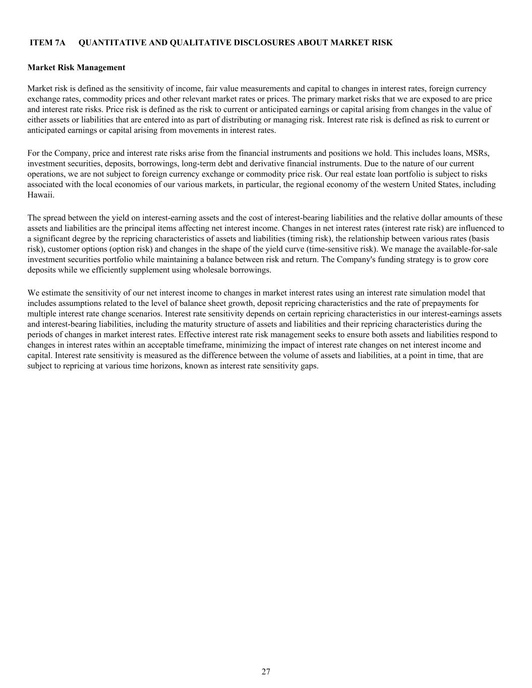 项目7a关于市场风险的定量和定性披露市场风险管理市场风险定义为收入、公允价值计量和资本对利率、外币汇率、商品价格和其他相关市场汇率或价格变动的敏感性。我们所面临的一级市场风险是价格和利率风险。价格风险被定义为作为分配或管理风险的一部分而订立的资产或负债的价值变化对当前或预期收益或资本产生的风险。利率风险定义为利率变动对当前或预期收益或资本造成的风险。对公司而言,价格和利率风险产生于我们持有的金融工具和头寸。这包括贷款、MSR、投资证券、存款、借款、长期债务和衍生金融工具。由于我们目前经营的性质,我们不受外汇兑换或商品价格风险的影响。我们的房地产贷款组合受到与我们各个市场的当地经济相关的风险,特别是美国西部的区域经济,包括夏威夷。生息资产收益率和计息负债成本之间的利差以及这些资产和负债的相对美元金额是影响净利息收入的主要项目。净利率(利率风险)的变化在很大程度上受资产负债重定价特征(择时风险)、各费率之间的关系(基差风险)、客户期权(期权风险)和收益率曲线形状变化(时效性风险)的影响。我们管理可供出售投资证券组合,同时保持风险与收益的平衡。公司的融资策略是增加核心存款,同时我们利用批发借款进行高效补充。我们使用利率模拟模型估计我们的净利息收入对市场利率变化的敏感性,该模型包括与资产负债表增长水平、存款重定价特征和多个利率变化情景下的提前还款率相关的假设。利率敏感性取决于我们的生息资产和计息负债中的某些重定价特征,包括资产和负债的期限结构及其在市场利率变动期间的重定价特征。有效的利率风险管理力求确保资产和负债在可接受的时间范围内对利率变化做出反应,最大限度地减少利率变化对净利息收入和资本的影响。利率敏感性衡量的是资产和负债数量之间的差异,在一个时间点上,在不同的时间范围内受到重新定价,称为利率敏感性缺口。27