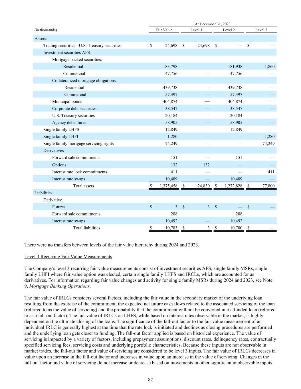12月31日,2023(单位:千)公允价值1级2级3级资产:交易证券-美国国债$ 24,698 $ 24,698 $ — $ —投资证券AFS抵押贷款支持证券:住宅183,798 — 181,9381,860商业47,756 — 47,756 —抵押抵押贷款债务:住宅439,738 — 439,738 —商业57,397 — 57,397 —市政债券404,874 —公司债务证券38,547 — 38,547 —美国国债20,184 — 20,184 —机构债券58,905 — 58,905 —单户LHFS 12,849 —单户LHFI 1,280 — 1,280单户抵押贷款服务权74,249 —— 74,249衍生品远期销售承诺151 — 151 ——期权132132 ——利率锁定承诺411 —— 411利率掉期10,489 — 10,489 ——总资产$ 1,375,458 $ 24,830 $ 1,272,828 $ 77,800负债:衍生品期货$ 3 $ 3 $ — $ — —远期销售承诺288 — 288 —利率掉期10,492 — 10,492 —总负债$ 10,783 $ 3 $ 10,780 $ — 2024和2023期间公允价值层级之间没有转移。第3级经常性公允价值计量公司的第3级经常性公允价值计量由投资证券AFS、单一家族MSR、选择公允价值期权的单一家族LHFI、某些单一家族LHFS和IRCL组成,作为衍生工具进行会计处理。有关2024和2023年单户MSR的公允价值变化和活动的信息,请参见附注9,抵押银行业务。IRLC的公允价值考虑了几个因素,包括行使承诺所产生的基础贷款在二级市场的公允价值、与贷款的相关服务相关的预期未来现金流量净额(简称服务价值)以及该承诺不会转化为融资贷款的可能性(简称后果因素)。LHFS上IRLC的公允价值虽然基于市场上可观察到的利率,但高度依赖于贷款的最终结账。退出因子对单个IRLC公允价值计量的显著性一般在利率锁定启动时最高,并随着平仓程序的执行和基础贷款与资金面的接近而下降。应用的下降因子是根据历史经验得出的。服务价值受到多种因素的影响,包括预付款假设、贴现率、拖欠率、合同规定的服务费、服务成本和基础投资组合特征。因为这些输入在市场交易中是无法观察到的,所以服务的下降因子和价值被认为是3级输入。IRLCs的公允价值在下降因子增加时价值下降,在服务价值增加时价值上升。服务的下降系数和价值的变化不会根据其他重要的不可观察投入的变动而增加或减少。82