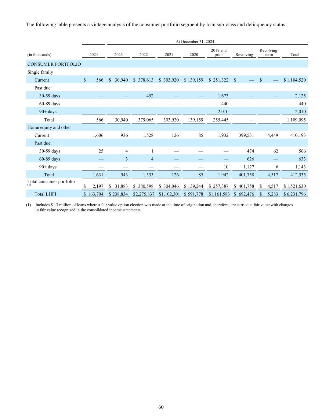 下表按贷款子类别和拖欠状况对消费者投资组合部分进行了年份分析:截至12月31日,2024年(单位:千)202420232022202120202019和以前的循环周期总消费者组合单户现值566美元30,940美元378,613美元303,920美元139,159美元251,322美元— 1,104,520美元逾期:30-59天—— 452 —— 1,673 —— 2,125 60-89天———— 440 —— 44090 +天———— 2,0 10 —— 2,0 10合计56630,940379,065303,920139,159255,445 —— 1,109,095房屋净值及其他往来款1,6069361,528126851,932399,5314,449410,193逾期:30-59天2541 ———— 47462566 60-89天— 34 ———— 626 — 63390 +天———— 101,12761,143合计1,6319431,533126851,942401,7584,517412,535消费者组合总额(1)2,197美元31,883美元380,598美元304,046美元139,244美元257,387美元401,758美元4,517美元1,521,630美元LHFI合计163,704美元238,834美元2,275,837美元1,102,301美元591,778美元1,161,583美元692,476包括在发起时作出公允价值选择的130万美元贷款,因此按公允价值列账,公允价值变动在综合损益表中确认。60