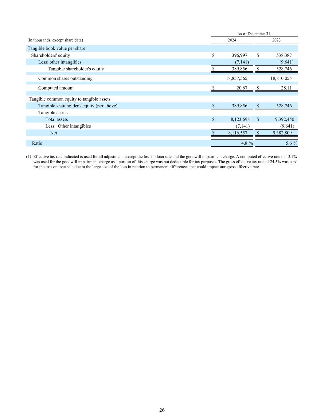 截至12月31日,(单位:千,20242023每股有形账面价值股东权益396,997美元538,387美元减:其他无形资产(7,141)(9,641)有形股东权益389,856美元528,746美元已发行普通股18,857,56518,810,055计算金额20.67美元28.11美元有形普通股权益与有形资产有形股东权益(以上)389,856美元528,746美元有形资产总资产8,123,698美元9,392,450美元减:其他无形资产(7,141)(9,641)净额8,116,557美元9,382,809美元比率4.8% 5.6%(1)所示有效税率用于除贷款出售损失和商誉减值费用外的所有调整。商誉减值费用使用了计算得出的13.1%的有效利率,因为该费用的一部分不可用于税收目的的扣除。总有效税率24.5%用于贷款销售的损失,因为与可能影响我们的总有效税率的永久性差异相关的损失规模很大。26