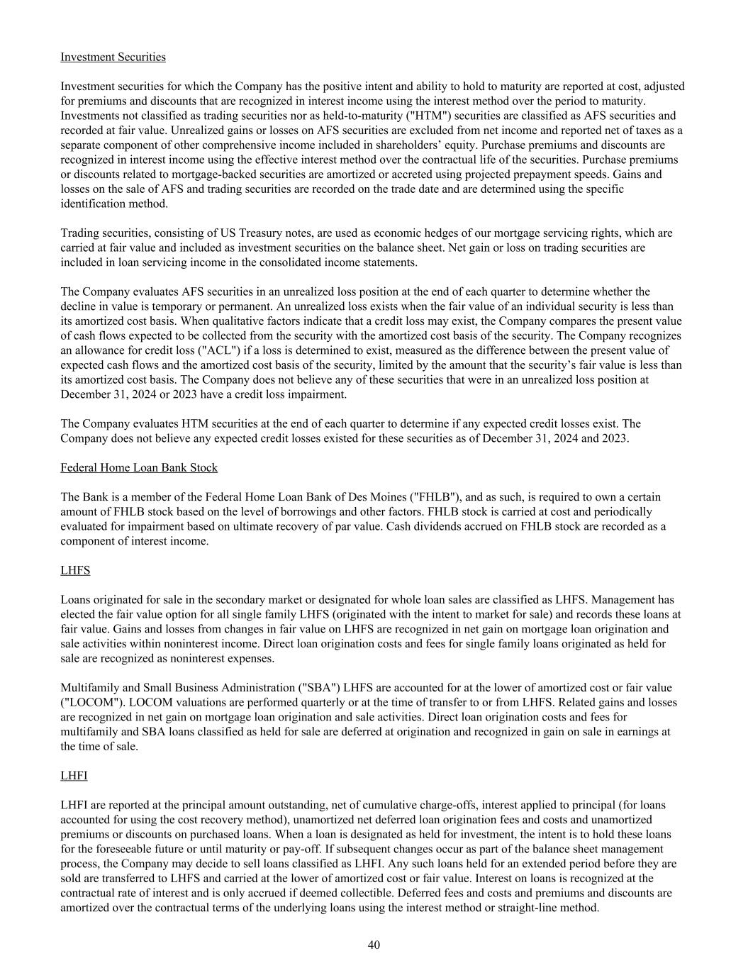 投资证券公司有积极意向和能力持有至到期的投资证券,按成本列报,并对到期期间采用利息法在利息收入中确认的溢价和折价进行调整。未归类为交易证券或持有至到期(“HTM”)证券的投资被归类为AFS证券并以公允价值入账。AFS证券的未实现收益或损失不计入净收益,并作为计入股东权益的其他综合收益的单独组成部分报告税后净额。购买溢价和折价在证券的合同期限内采用实际利率法确认为利息收入。与抵押贷款支持证券相关的购买溢价或折扣使用预计的提前还款速度进行摊销或增值。出售AFS和交易证券的收益和损失记录在交易日,并使用特定的识别方法确定。交易证券,由美国国债组成,被用作我们抵押贷款服务权的经济对冲,这些抵押贷款服务权按公允价值列账,并作为投资证券计入资产负债表。买卖证券的净收益或亏损计入综合损益表的贷款服务收入。该公司在每个季度末评估处于未实现亏损位置的AFS证券,以确定价值下降是暂时性的还是永久性的。当单个证券的公允价值小于其摊余成本基础时,存在未实现亏损。当定性因素表明可能存在信用损失时,公司将预期从该证券收取的现金流量现值与该证券的摊余成本基础进行比较。如果确定存在损失,公司确认信用损失准备金(“ACL”),以预期现金流量现值与证券的摊余成本基础之间的差额计量,以证券的公允价值低于其摊余成本基础的金额为限。公司认为,在2024年12月31日或2023年处于未实现亏损状态的这些证券中,没有任何出现信用损失减值。公司在每个季度末对HTM证券进行评估,以确定是否存在任何预期的信用损失。公司认为,截至2024年12月31日和2023年12月31日,这些证券不存在任何预期信用损失。联邦Home Loan银行股票该银行是联邦丨得梅因银行(“FHLB”)的成员,因此需要根据借款水平等因素拥有一定数量的FHLB股票。FHLB股票按成本列账,并根据票面价值的最终回收情况定期进行减值评估。FHLB股票应计现金股息作为利息收入的一部分入账。发起于二级市场销售或指定用于整贷销售的LHFS贷款被归类为LHFS。管理层选择了所有单户LHFS的公允价值选择权(起源于市场销售的意图),并以公允价值记录这些贷款。LHFS公允价值变动损益在非利息收入内的抵押贷款发起和销售活动净收益中确认。发起为持有待售的单户贷款的直接贷款发起成本和费用确认为非利息费用。多户家庭和小型企业管理局(“SBA”)LHFS按摊余成本或公允价值(“LOCOM”)中的较低者入账。LOCOM估值每季度或在转入或转出LHFS时进行。相关损益在抵押贷款发起和销售活动的净收益中确认。分类为持有待售的多户家庭和SBA贷款的直接贷款发起成本和费用在发起时递延,并在出售时在收益中确认为销售收益。LHFI LHFI按未偿还本金、扣除累计冲销、适用于本金的利息(对于使用成本回收法核算的贷款)、未摊销的递延贷款发起费用和成本净额以及购买贷款的未摊销溢价或折扣报告。当一笔贷款被指定为为投资而持有时,其意图是在可预见的未来或直到到期或还清为止持有这些贷款。如果后续变化作为资产负债表管理流程的一部分发生, 公司可能会决定出售归类为LHFI的贷款。任何在出售前长期持有的此类贷款都将转入LHFS,并按摊余成本或公允价值中的较低者列账。贷款利息按合同利率确认,仅在被视为可收回时才计提。递延费用和成本以及溢价和折价采用利息法或直线法在基础贷款的合同条款内摊销。40