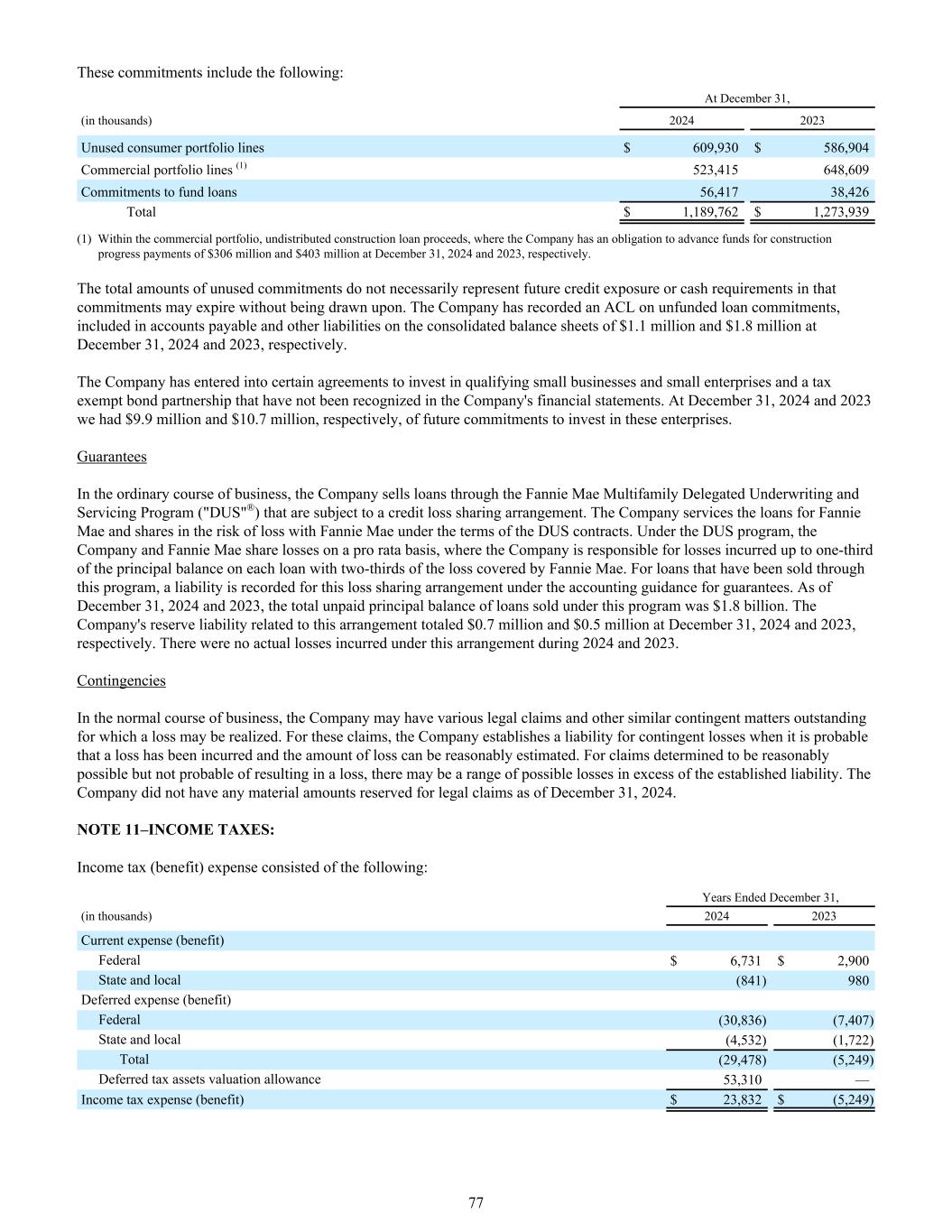 这些承诺包括:截至12月31日,(以千为单位)20242023未使用的消费者投资组合项目609,930美元586,904美元商业投资组合项目(1)523,415648,609承诺为贷款提供资金56,41738,426美元总计1,189,762美元1,273,939美元(1)商业投资组合内,未分配的建设贷款收益,其中公司有义务在2024年12月31日和2023年12月31日分别为3.06亿美元和4.03亿美元的建设进度付款垫付资金。未使用的承诺总额不一定代表未来的信用风险或现金需求,因为该承诺可能会到期而不会被提取。该公司在2024年12月31日和2023年12月31日记录了未提供资金的贷款承诺的ACL,包括在合并资产负债表的应付账款和其他负债中,分别为110万美元和180万美元。公司已订立若干投资于合资格小型企业及小型企业及免税债券合伙企业的协议,而该等协议并未在公司财务报表中确认。截至2024年12月31日和2023年12月31日,我们分别有990万美元和1070万美元的未来承诺投资于这些企业。担保在日常业务过程中,公司通过Fannie Mae Multifamily Delegated Underwriting and Servicing Program(“DUS”®)受信用损失分担安排约束的。该公司为房利美的贷款提供服务,并根据DUS合同条款与房利美分担损失风险。根据DUS计划,公司和房利美按比例分担损失,其中公司负责承担每笔贷款最高达本金余额三分之一的损失,其中三分之二的损失由房利美承担。对于已通过该计划出售的贷款,根据担保的会计指导,为这一损失分担安排记录一项负债。截至2024年12月31日和2023年12月31日,根据该计划出售的贷款的未偿还本金余额总额为18亿美元。截至2024年12月31日和2023年12月31日,公司与这一安排相关的准备金负债总额分别为0.7百万美元和0.5百万美元。在2024年和2023年期间,没有根据这一安排发生实际损失。或有事项在正常经营过程中,公司可能会有各种法律索赔和其他类似的或有事项未决而可能实现损失。对于这些索赔,本公司在很可能已经发生损失且损失金额能够合理估计时确立或有损失赔偿责任。对于确定为合理可能但不太可能造成损失的索赔,可能存在超出既定赔偿责任的可能损失范围。截至2024年12月31日,公司没有任何为法律索赔预留的重大金额。注11 –所得税:所得税(福利)费用包括:截至12月31日的年度,(以千为单位)20242023当前费用(福利)联邦6,731美元2,900美元州和地方(841)980递延费用(福利)联邦(30,836)(7,407)州和地方(4,532)(1,722)总计(29,478)(5,249)递延所得税资产估值备抵53,310 —所得税费用(福利)23,832美元(5,249)77