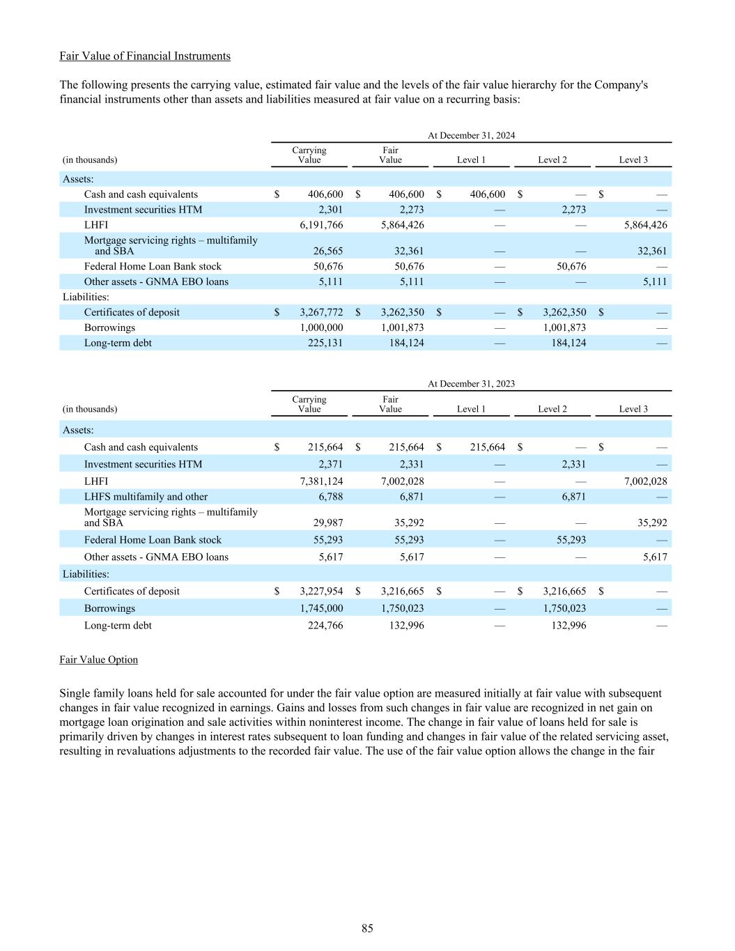 金融工具公允价值以下列示公司非经常性以公允价值计量的资产和负债的金融工具的账面价值、估计公允价值及公允价值层级:截至12月31日,2024年(单位:千)账面价值公允价值Level 1 Level 2 Level 3 Assets:Cash and cash equivalents $ 406600 $ 406600 $ 406600 $ — $ — Investment securities HTM 2,3012,273 — 2,273 — LHFI 6,191,7665,864,426 —— 5,864,426 Mortgage service rights – multifamily和SBA 26,56532,361 —— 32,361联邦Home Loan银行股票50,67650,676 — 50,676 —其他资产-GNMA EBO贷款5,1115,111 —— 5,111负债:存单$ 3,267,772 $ 3,262,350 $ — 3,262,350 $ —借款1,000,0001,001,873 — 1,001,873 —长期债务225,131184,124 — 184,124 — 12月31日,2023年(单位:千)账面价值公允价值第1级第2级第3级资产:现金和现金等价物$ 215664 $ 215664 $ 215664 $ — $ —投资证券HTM 2,3712,331 — 2,331 — LHFI 7,381,1247,002,028 —— 7,002,028 LHFS多户和其他6,7886,871 — 6,871 —抵押贷款服务权–多户和SBA 29,98735,292 —— 35,292联邦Home Loan银行股55,29355,293 — 55,293 —其他资产-GNMA EBO贷款5,6175,617 —— 5,617负债:存单$ 3,227,954 $ 3,216,665 $ — $ 3,216,665 $ —借款1,745,0001,750,023 — 1,750,023 —长期债务224,766132,996 — 132,996 —公允价值选择权下核算的持有待售单一家庭贷款初始按公允价值计量,公允价值的后续变动计入收益。此类公允价值变动产生的损益在非利息收入内的抵押贷款发起和销售活动净收益中确认。持作出售贷款的公允价值变动主要是由于贷款融资后的利率变动以及相关服务资产的公允价值变动导致对入账公允价值进行重估调整。公允价值期权的使用允许公允价值变动85
