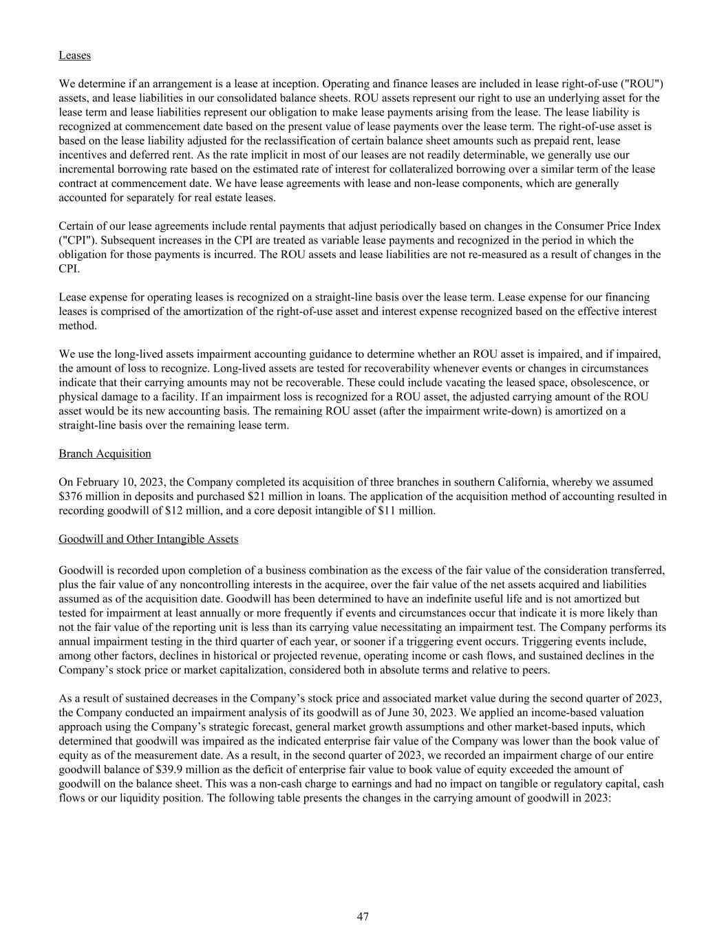 租约我们在开始时确定一项安排是否为租约。经营和融资租赁包含在租赁使用权(“ROU”)资产中,租赁负债包含在我们的综合资产负债表中。ROU资产代表我们在租赁期内使用标的资产的权利,租赁负债代表我们支付租赁产生的租赁付款的义务。租赁负债在开始日根据租赁期内租赁付款额的现值确认。使用权资产以预付租金、租赁奖励和递延租金等部分资产负债表金额重分类调整后的租赁负债为基础。由于我们大多数租赁的内含利率不容易确定,我们一般使用我们的增量借款利率,基于租赁合同类似期限的抵押借款在开始日的估计利率。我们有包含租赁和非租赁部分的租赁协议,这些通常在房地产租赁中单独核算。我们的某些租赁协议包含根据消费者价格指数(“CPI”)的变化定期调整的租金付款。随后CPI的上涨被视为可变租赁付款,并在该等付款的义务发生期间确认。使用权资产和租赁负债不因CPI变动而重新计量。经营租赁的租赁费用在租赁期内按直线法确认。我们融资租赁的租赁费用由使用权资产摊销和按实际利率法确认的利息费用组成。我们使用长期资产减值会计指引来确定ROU资产是否发生减值,如果发生减值,确认损失金额。每当有事件或情况变化表明其账面值可能无法收回时,就对长期资产进行可收回性测试。这些可能包括腾出租用的空间、过时或对设施造成物理损坏。如果对ROU资产确认减值损失,ROU资产的调整后账面值将是其新的会计基础。剩余ROU资产(减值减记后)在剩余租期内按直线法摊销。Branch Acquisition 2023年2月10日,公司完成了对南加州三家分公司的收购,据此我们承担了3.76亿美元的存款,并购买了2100万美元的贷款。采用收购会计法导致录得商誉1200万美元,核心存款无形资产1100万美元。商誉和其他无形资产商誉在企业合并完成时记录为转让对价的公允价值加上被收购方任何非控制性权益的公允价值超过截至收购日期所收购的净资产和承担的负债的公允价值的部分。商誉已被确定为具有不确定的使用寿命,并且不摊销,但至少每年或更频繁地进行减值测试,如果发生的事件和情况表明报告单位的公允价值很可能低于其账面价值,则需要进行减值测试。公司在每年第三季度进行年度减值测试,如果触发事件发生则更早进行。触发事件包括,除其他因素外,历史或预计收入、营业收入或现金流的下降,以及公司股价或市值的持续下跌,无论是从绝对值还是相对于同行来看。由于公司股价和相关市值在2023年第二季度持续下跌,公司对截至2023年6月30日的商誉进行了减值分析。我们运用公司战略预测、一般市场增长假设和其他市场化投入,采用基于收益的估值方法,确定商誉减值为公司所示企业公允价值低于计量日权益的账面价值。因此,在2023年第二季度,由于企业公允价值与权益账面价值的赤字超过了资产负债表上的商誉金额,我们对全部商誉余额记录了3990万美元的减值费用。这是对收益的非现金费用,对有形资本或监管资本、现金流或我们的流动性状况没有影响。下表列示2023年商誉账面价值变动情况:47