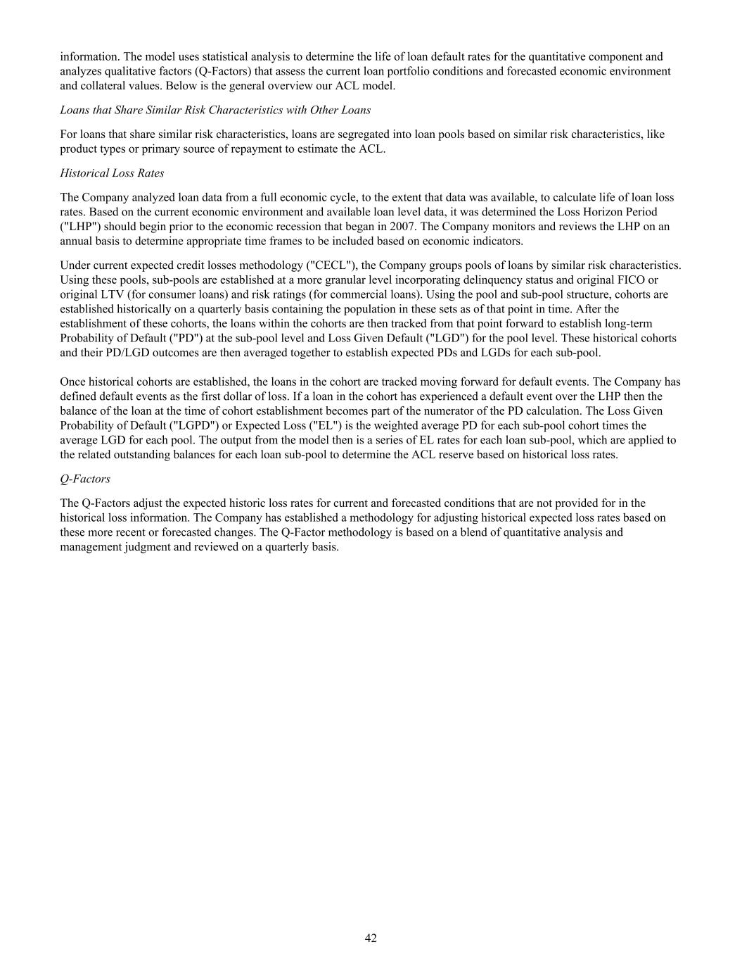 信息。该模型使用统计分析来确定贷款违约率的期限为定量成分,并分析评估当前贷款组合状况和预测经济环境和抵押品价值的定性因素(Q-Factors)。下面是我们ACL模型的总体概述。与其他贷款具有相似风险特征的贷款对于具有相似风险特征的贷款,根据相似的风险特征,将贷款划分为贷款池,如产品类型或主要还款来源,以估算ACL。历史损失率公司从全经济周期分析贷款数据,在数据可得的范围内,计算贷款损失率的寿命。根据当前的经济环境和现有的贷款水平数据,确定损失视界期(“LHP”)应在2007年开始的经济衰退之前开始。该公司每年对LHP进行监测和审查,以根据经济指标确定适当的纳入时间框架。在当前预期信用损失方法(“CECL”)下,公司按相似的风险特征对贷款池进行分组。使用这些池,子池以更细粒度的级别建立,其中包含拖欠状态和原始FICO或原始LTV(针对消费者贷款)和风险评级(针对商业贷款)。使用池和子池结构,历史上每季度建立队列,包含截至该时间点这些集合中的总体。在建立这些群组后,然后从该点开始跟踪群组内的贷款,以建立子池级别的长期违约概率(“PD”)和池级别的违约损失(“LGD”)。然后将这些历史群组及其PD/LGD结果一起平均,以建立每个子池的预期PD和LGD。一旦建立了历史群组,就会跟踪群组中的贷款是否发生违约事件。该公司将违约事件定义为损失的第一块钱。如果队列中的贷款经历了LHP违约事件,那么在队列建立时的贷款余额将成为PD计算的分子的一部分。违约概率损失(“LGPD”)或预期损失(“EL”)是每个子池群组的加权平均PD乘以每个池的平均LGD。然后模型输出的是每个贷款子池的一系列EL利率,这些利率应用于每个贷款子池的相关未偿余额,以根据历史损失率确定ACL准备金。Q-因子Q-因子针对历史损失信息中未提供的当前和预测情况调整预期历史损失率。公司建立了根据这些最近或预测的变化调整历史预期损失率的方法。Q-Factor方法论基于量化分析和管理层判断的混合,每季度进行一次审查。42