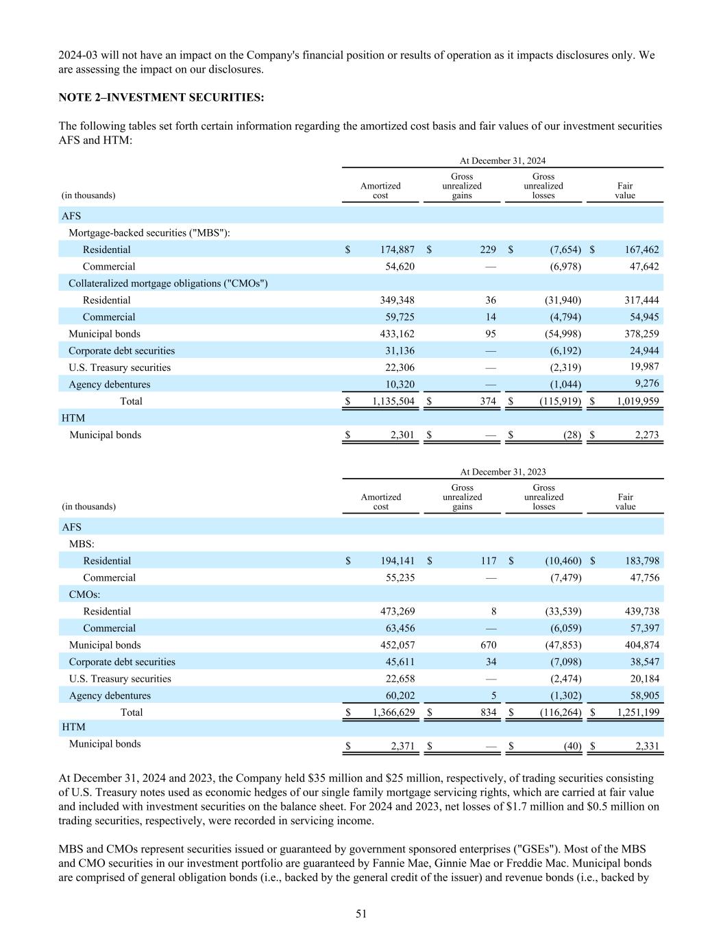 2024-03仅影响披露,因此不会对公司财务状况或经营业绩产生影响。我们正在评估对我们披露的影响。注2 –投资证券:下表列出了有关我们投资证券AFS和HTM的摊余成本基础和公允价值的某些信息:截至12月31日,2024(千)摊余成本未实现收益总额未实现亏损总额公允价值AFS抵押贷款支持证券(“MBS”):住宅$ 174,887 $ 229 $(7,654)$ 167,462商业54,620 —(6,978)47,642抵押抵押债务(“CMO”)住宅349,34836(31,940)317,444商业59,72514(4,794)54,945市政债券433,16295(54,998)378,259公司债务证券31,136 —(6,192)24,944美国国债22,306 —(2,319)19,987机构债券10,320 —(1,044)9,276总计$ 1,135,504 $ 374 $(115,919)$ 1,02023(千)摊余成本未实现收益总额未实现亏损总额公允价值AFS MBS:住宅$ 194141 $ 117 $(10460)$ 183,798商业55,235 —(7,479)47,756 CMO:住宅473,2698(33,539)439,738商业63,456 —(6,059)57,397市政债券452,057670(47,853)404,874公司债务证券45,61134(7,098)38,547美国国债22,658 —(2,474)20,184机构债券60,2025(1,302)58,905总计1,366,629美元834美元(116,264)1,251,199美元HTM市政债券2,371美元—(40)2,33该公司分别持有3500万美元和2500万美元的交易证券,这些证券由美国国债组成,用作我们单一家庭抵押贷款服务权的经济对冲,这些证券按公允价值列报,并与资产负债表上的投资证券一起包括在内。2024年和2023年,交易证券净亏损分别为170万美元和50万美元,计入服务收入。MBS和CMO是指由政府担保企业(“GSES”)发行或担保的证券。我们投资组合中的大部分MBS和CMO证券由房利美、金妮美或房地美提供担保。市政债券由一般义务债券(即由发行人的一般信用支持)和收入债券(即由51