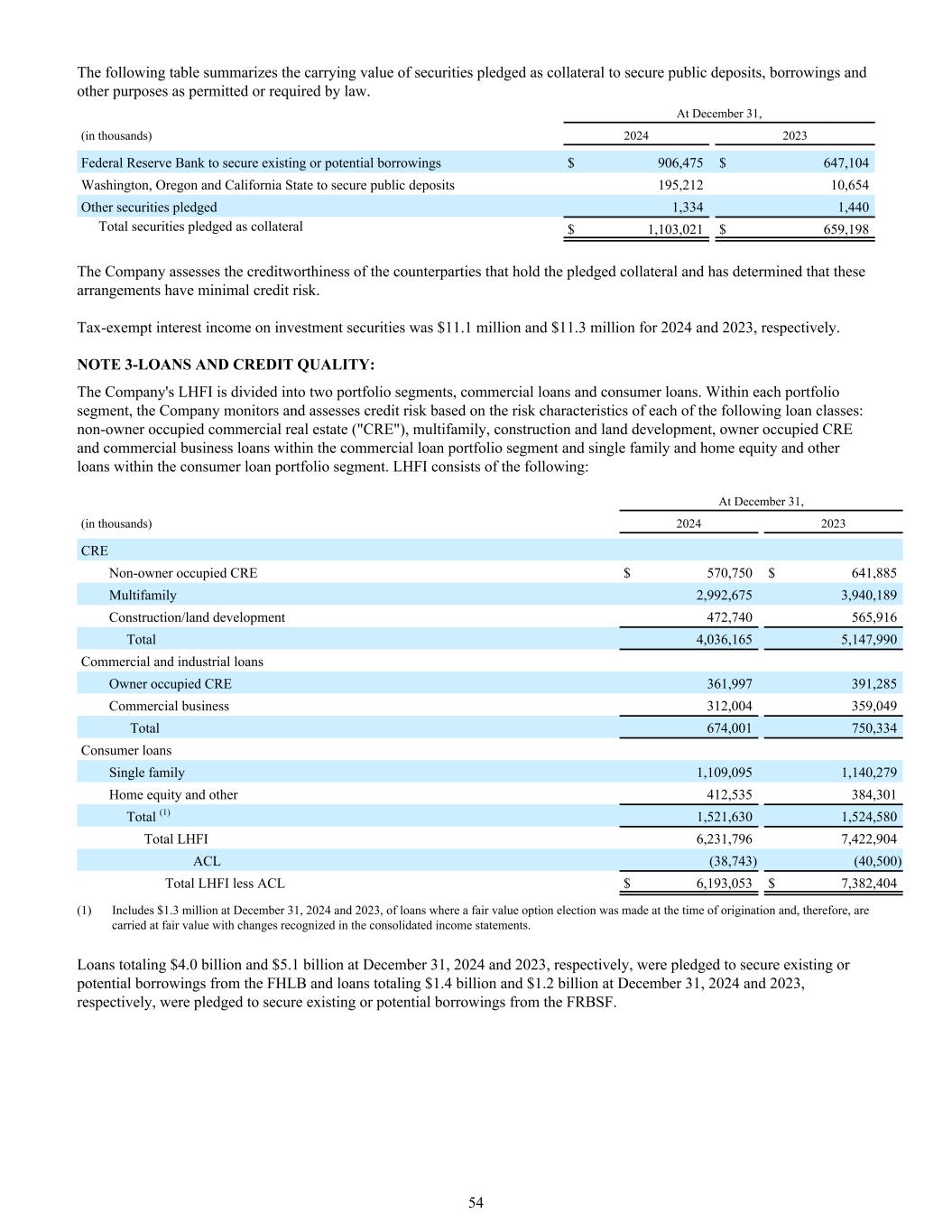 下表汇总了质押为担保公众存款、借款和法律允许或要求的其他用途的抵押品的证券的账面价值。截至12月31日(单位:千)20242023联邦储备银行担保现有或潜在借款906,475美元647,104美元华盛顿州、俄勒冈州和加利福尼亚州担保公共存款195,21210,654其他质押证券1,3341,440作为抵押品的证券总额1,103,021美元659,198美元公司评估持有质押抵押品的交易对手的信誉,并确定这些安排的信用风险很小。2024年和2023年投资证券的免税利息收入分别为1110万美元和1130万美元。注3-贷款和信贷质量:公司的LHFI分为两个投资组合部分,商业贷款和消费者贷款。在每个投资组合分部内,公司根据以下每个贷款类别的风险特征监测和评估信用风险:商业贷款组合分部内的非自住商业房地产(“CRE”)、多户家庭、建筑和土地开发、自住CRE和商业商业贷款以及消费贷款组合分部内的单户家庭和房屋净值及其他贷款。LHFI包括:截至12月31日,(千)20242023 CRE非业主占用CRE $ 570,750 $ 641,885 Multifamily 2,992,6753,940,189建筑/土地开发472,740565,916合计4,036,1655,147,990商业和工业贷款业主占用CRE 361,997391,285商业业务312,004359,049合计674,001750,334消费贷款单一家庭1,109,0951,140,279房屋净值和其他412,535384,301合计(1)1,521,6301,524,580 LHFI合计6,231,7967,422,904 ACL(38,743)(40,500)LHFI在发起时作出公允价值选择权的贷款,因此按公允价值列账并在综合损益表中确认变动。2024年12月31日和2023年12月31日的贷款总额分别为40亿美元和51亿美元,用于担保FHLB的现有或潜在借款,2024年12月31日和2023年12月31日的贷款总额分别为14亿美元和12亿美元,用于担保FRBSF的现有或潜在借款。54