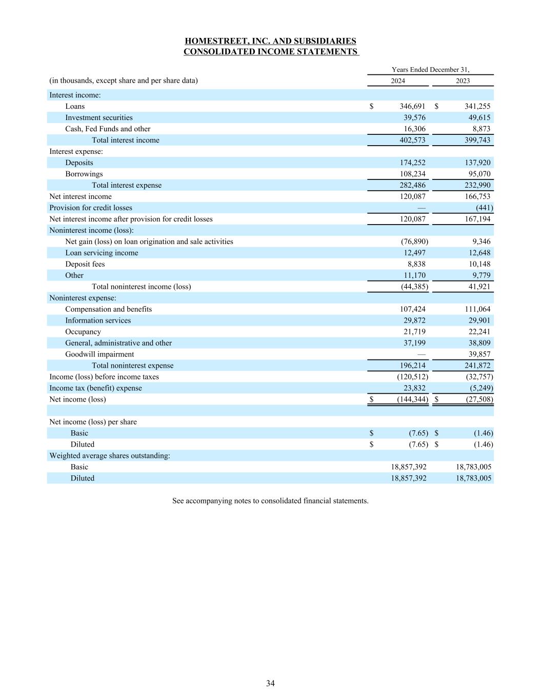Homestreet, Inc.截至12月31日的年度和子公司合并损益表,(单位:千,股份和每股数据除外)20242023利息收入:贷款346,691美元341,255美元投资证券39,57649,615现金,联邦基金及其他16,3068,873总利息收入402,573 399,743利息支出:存款174,252137,920借款108,23495,070总利息支出282,486232,990净利息收入120,087166,753信用损失准备——(441)计提信用损失准备后的净利息收入120,087167,194非利息收入(损失):贷款发放和销售活动的净收益(损失)(76,890)9,346贷款服务收入12,49712,648存款费8,83810,148其他11,1709,779总非利息收入(损失)(44,385)41,921非利息支出:薪酬和福利107,424111,064信息服务29,87229,901占用21,71922,241行政及其他37,19938,809商誉减值— 39,857非利息费用总额196,214241,872所得税前收入(亏损)(120,512)(32,757)所得税(收益)费用23,832(5,249)净收入(亏损)$(144,344)$(27,508)每股净收入(亏损)基本$(7.65)$(1.46)稀释后$(7.65)$(1.46)加权平均流通股:基本18,857,39218,783,005稀释后18,857,39218,783,005见合并财务报表附注。34