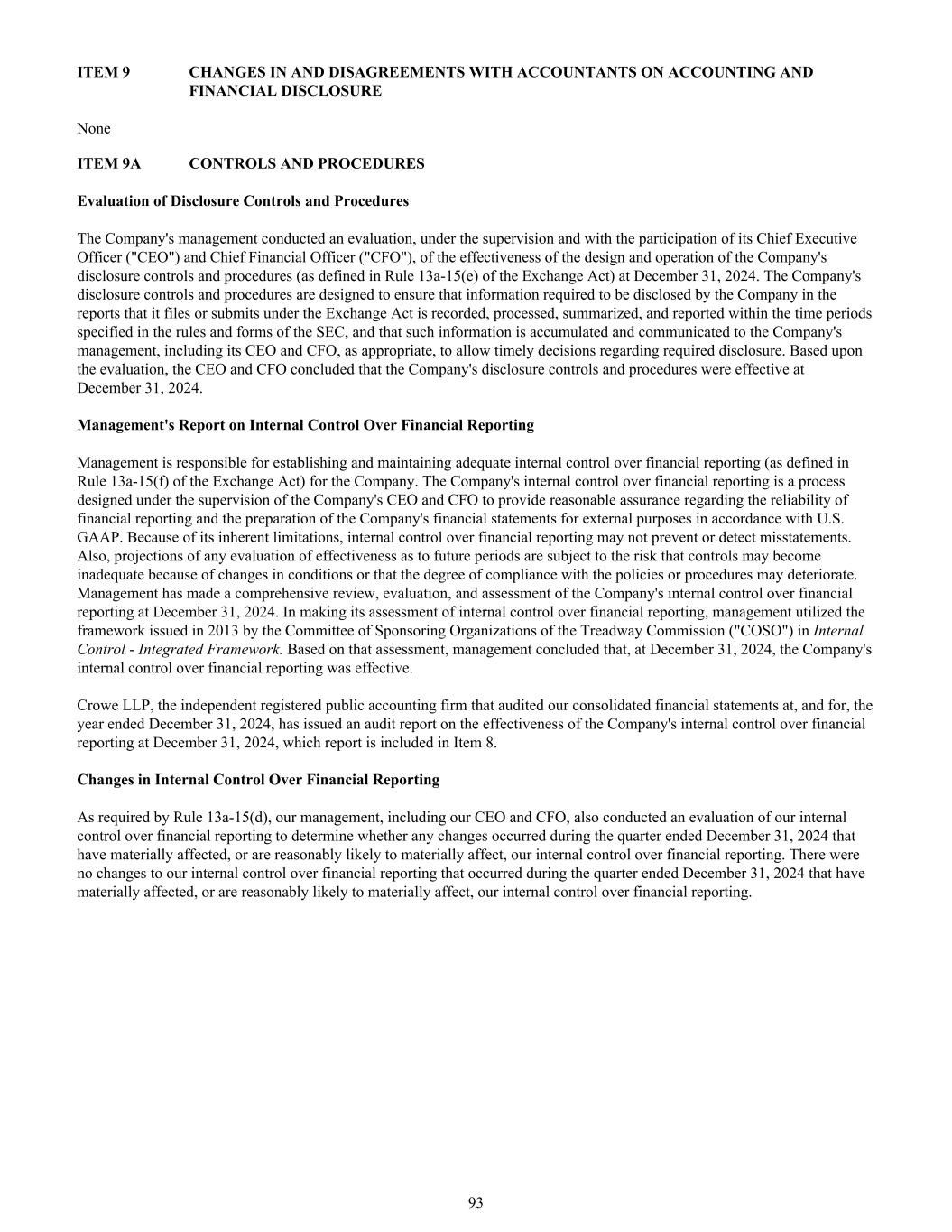 项目9会计和财务披露方面的变化和与会计师的分歧无项目9a控制和程序对披露控制和程序的评估公司管理层在首席执行官(“CEO”)和首席财务官(“CFO”)的监督和参与下,于2024年12月31日对公司披露控制和程序(定义见《交易法》第13a-15(e)条)的设计和运作的有效性进行了评估。公司的披露控制和程序旨在确保公司在其根据《交易法》提交或提交的报告中要求披露的信息在SEC规则和表格规定的时间段内得到记录、处理、汇总和报告,并且这些信息被积累并酌情传达给公司管理层,包括其首席执行官和首席财务官,以便及时就所要求的披露做出决定。根据评估,首席执行官和首席财务官得出结论,公司的披露控制和程序于2024年12月31日生效。管理层关于财务报告内部控制的报告管理层负责为公司建立和维护充分的财务报告内部控制(定义见《交易法》第13a-15(f)条)。公司对财务报告的内部控制是在公司首席执行官和首席财务官的监督下设计的一个过程,旨在为财务报告的可靠性以及根据美国公认会计原则为外部目的编制公司财务报表提供合理保证。财务报告内部控制由于其固有的局限性,可能无法防止或发现错报。此外,对未来期间的任何有效性评估的预测都受到以下风险的影响:由于条件的变化,控制可能变得不充分,或者政策或程序的遵守程度可能恶化。管理层对公司截至2024年12月31日的财务报告内部控制情况进行了全面的审查、评价、评估。在对财务报告的内部控制进行评估时,管理层使用了Treadway委员会(“COSO”)发起组织委员会于2013年在内部控制中发布的框架-综合框架。基于该评估,管理层得出结论,于2024年12月31日,公司对财务报告的内部控制是有效的。截至2024年12月31日止年度审计我们合并财务报表的独立注册会计师事务所Crowe LLP已就公司于2024年12月31日财务报告内部控制的有效性出具审计报告,该报告包含在项目8中。财务报告内部控制的变化根据规则13a-15(d)的要求,我们的管理层,包括我们的首席执行官和首席财务官,也对我们的财务报告内部控制进行了评估,以确定在截至2024年12月31日的季度期间是否发生了对我们的财务报告内部控制产生重大影响或合理可能产生重大影响的任何变化。在截至2024年12月31日的季度期间,我们对财务报告的内部控制没有发生任何对我们的财务报告内部控制产生重大影响或合理可能产生重大影响的变化。93