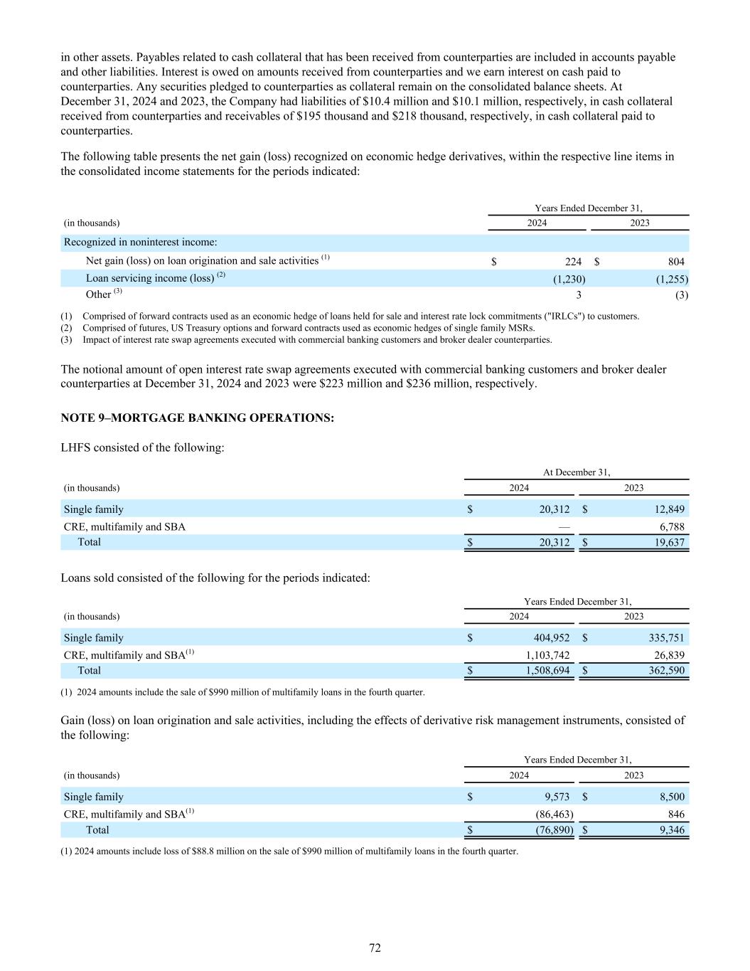 在其他资产中。已收到交易对手的与现金担保物相关的应付款项计入应付账款和其他负债。利息是从交易对手收到的金额所欠,我们从支付给交易对手的现金中赚取利息。作为抵押品质押给交易对手的任何证券仍保留在合并资产负债表上。在2024年12月31日和2023年12月31日,公司分别有1040万美元和1010万美元的负债,从交易对手收到的现金抵押品和支付给交易对手的现金抵押品的应收款分别为19.5万美元和21.8万美元。下表列出经济对冲衍生工具确认的净收益(损失),在所示期间的综合损益表的相应细目内:截至12月31日的年度,(以千为单位)20242023在非利息收入中确认:贷款发起和销售活动的净收益(损失)(1)224美元804美元贷款服务收入(损失)(2)(1,230)(1,255)其他(3)3(3)(1)包括用作对持作出售贷款的经济对冲的远期合约和对客户的利率锁定承诺(“IRLC”)。(2)由作为单一家族MSR经济对冲的期货、美国国债期权和远期合约组成。(3)与商业银行客户、经纪交易商交易对手执行利率互换协议的影响。2024年12月31日和2023年12月31日与商业银行客户和经纪交易商交易对手执行的未平仓利率掉期协议的名义金额分别为2.23亿美元和2.36亿美元。注9 –抵押银行业务:LHFS包括:截至12月31日,(以千为单位)20242023单户家庭20,312美元12,849美元CRE、多户家庭和SBA — 6,788总计20,312美元19,637美元已售贷款包括所示期间的以下内容:截至12月31日的年度,(以千为单位)20242023单户家庭404,952美元335,751美元CRE、多户家庭和SBA(1)1,103,74226,839总计1,508,694美元362,590美元(1)2024年金额包括第四季度出售的9.9亿美元多户家庭贷款。贷款发起和销售活动的收益(损失),包括衍生风险管理工具的影响,包括以下内容:截至12月31日的年度,(以千为单位)20242023单一家庭$ 9,573 $ 8,500 CRE、多家庭和SBA(1)(86,463)846总计$(76,890)$ 9,346(1)2024金额包括第四季度出售9.9亿美元多家庭贷款的8880万美元损失。72