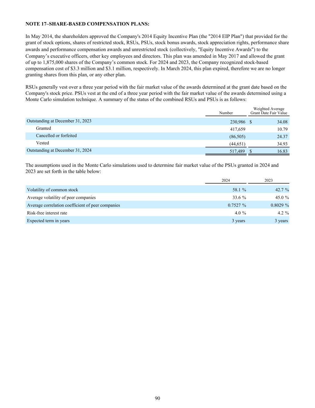 注17 –股权激励计划:2014年5月,股东批准了公司2014年股权激励计划(“2014年EIP计划”),该计划规定向公司高管、其他关键员工和董事授予股票期权、限制性股票份额、RSU、PSU、股票红利奖励、股票增值权、业绩股份奖励和业绩补偿奖励以及无限售条件股票(统称“股权激励奖励”)。该计划于2017年5月进行了修订,允许授予最多1,875,000股公司普通股。对于2024年和2023年,公司确认的股票薪酬成本分别为330万美元和310万美元。2024年3月,该计划到期,因此我们不再从该计划中授予股份,或任何其他计划。RSU一般在三年期间内归属,授予日根据公司股价确定的奖励的公允市场价值。PSU在三年期结束时授予使用蒙特卡洛模拟技术确定的奖励的公平市场价值。合并后的RSU和PSU的状况汇总如下:2023年12月31日未偿还的加权平均授予日公允价值230,986美元34.08已授予417,65910.79已取消或没收(86,505)24.37已归属(44,651)34.93 12月31日未偿还,2024517,489 $ 16.83用于确定2024年和2023年授予的PSU的公平市场价值的蒙特卡洛模拟中使用的假设如下表所示:20242023普通股波动率58.1% 42.7%同行公司平均波动率33.6% 45.0%同行公司平均相关系数0.75 27% 0.80 29%无风险利率4.0% 4.2%预期期限3年3年90