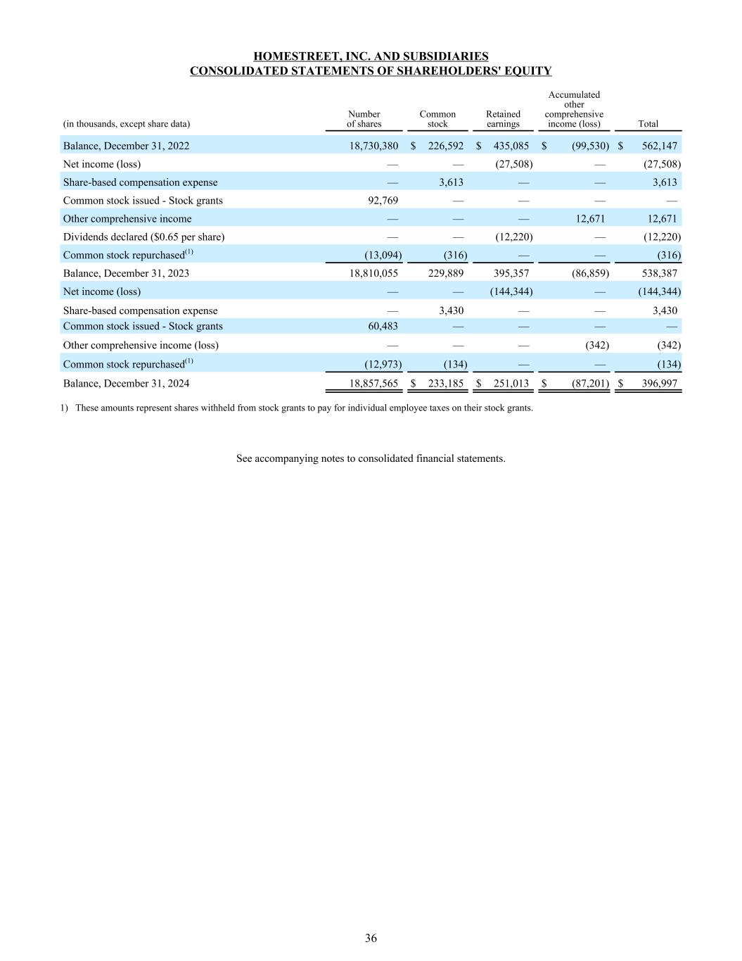 Homestreet, Inc.及附属公司合并股东权益报表(单位:千,股份数据除外)股数普通股留存收益累计其他综合收益(亏损)总余额,2022年12月31日18,730,380 $ 226,592 $ 435,085 $(99,530)$ 562,147净收益(亏损)——(27,508)——(27,508)股份补偿费用—— 3,613 —— 3,613已发行普通股——股票授予92,769 ————其他综合收益—— 12,67112,671宣派股息(每股0.65美元)——(12,220)——(12,220)回购普通股(1)(13,094)(316)——(316)余额,12月31日202318,810,055229,889395,357(86,859)538,387净收益(亏损)——(144,344)——(144,344)股份补偿费用—— 3,430 —— 3,430已发行普通股-股票授予60,483 ————其他综合收益(亏损)————(342)(342)回购普通股(1)(12,973)(134)——(134)余额,2024年12月31日18,857,565美元233,185美元251,185美元251,013美元(87,201)396,997美元1)这些金额代表从股票授予中扣留的股票,以支付其股票授予的个人雇员税款。见所附合并财务报表附注。36