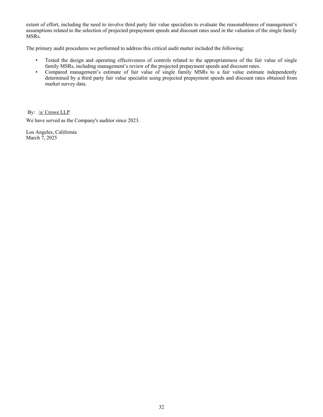 努力程度,包括需要让第三方公允价值专家参与,以评估管理层有关选择单家MSR估值中使用的预计预付款速度和贴现率的假设的合理性。我们为处理这一关键审计事项而执行的主要审计程序包括:•测试了与单户MSR公允价值适当性相关的控制措施的设计和运营有效性,包括管理层对预计的提前还款速度和贴现率的审查。•将管理层对单户MSR公允价值的估计与第三方公允价值专家使用从市场调查数据中获得的预计预付款速度和贴现率独立确定的公允价值估计进行比较。作者:/s/Crowe LLP我们自2023年起担任公司的审计师。加利福尼亚州洛杉矶2025年3月7日32