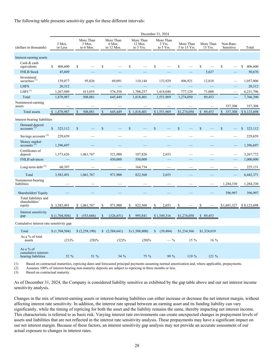 下表列出了这些不同间隔的灵敏度差距:2024年12月31日(千美元)3个Mos.或更少超过3个Mos.至6个Mos。超过6个月。至12个月。超过12个月。至3年。3年以上。至5年。超过5至15年。超过15年。对利率不敏感的总生息资产现金和现金等价物$ 406,600 $ — $ — $ — $ — $ — $ — $ — $ — $ — $ — $ 406,600 FHLB股票45,049 —————— 5,627 — 50,676投资证券(1)139,07795,02669,091110,144133,929496,92112,818 — 1,057,0 06 LHFS 20,312 —————— 20,312 LHFI(1)1,267,949413,055576,3581,708,2571,418,040777,12971,008 — 6,231,796合计1,878,987508,081645,4491,818,4011,55645,449美元1,818,401美元1,551,969美元1,274,050美元89,453美元357,308美元8,123,698美元有息负债活期存款账户(2)323,112美元— $ — $ — $ — $ — $ — 323,112美元储蓄账户(2)229,659 ———————— 229,659货币市场账户(2)1,396,697 —————— 1,396,697存单1,573,6261,767521,900107,8262,653 —— 3,267,772 FHLB垫款—— 450,000550,000 ———— 1,000,000长期债务(3)60,397 —— 164,734 ———— 225,131合计3,583,4911,061,767971,900822,5602,653 —— 6,442,371无息负债———————— 1,284,3301,284,330股东权益———————— 396,997396,997负债合计和股东权益$ 3,583,491 $ 1,061,767 $ 971,900 $ 822,560 $ 2,653 $ — $ — $ 1,681,327 $ 8,123,698利息敏感性缺口$(1,704,504)$(553,686)$(326,451)$ 995,841 $ 1,549,316 $ 1,274,050 $ 89,453累计利率敏感性缺口合计$(1,704,504)$(2,258,190)$(2,584,641)$(1,588,800)$(39,484)$ 1,234,566 $ 1,324,019占总资产比例(21)%(28)%(32)%(20)%—%(1)基于合同到期日、重新定价日期和预测的本金支付假设正常摊销和(如适用)预付款。(2)假设100%计息未到期存款在三个月或更短时间内进行重定价。(三)以合同约定期限为基础。截至2024年12月31日,公司被认为是负债敏感,如上面的缺口表和我们的净利息收入敏感性分析所示。生息资产或计息负债组合的变化,可以提高或降低净息差,不影响利率敏感性。此外,盈利资产与其资金负债之间的利差可能会有很大差异,而资产和负债的重新定价时间保持不变,从而影响净利息收入。这一特征被称为基差风险。不同的利率环境可能会造成资产和负债的提前还款水平的意外变化,而这些变化并未反映在利率敏感性分析中。这些预付款可能会对我们的净息差产生重大影响。由于这些因素,利率敏感性缺口分析可能无法准确评估我们对利率变化的实际敞口。28