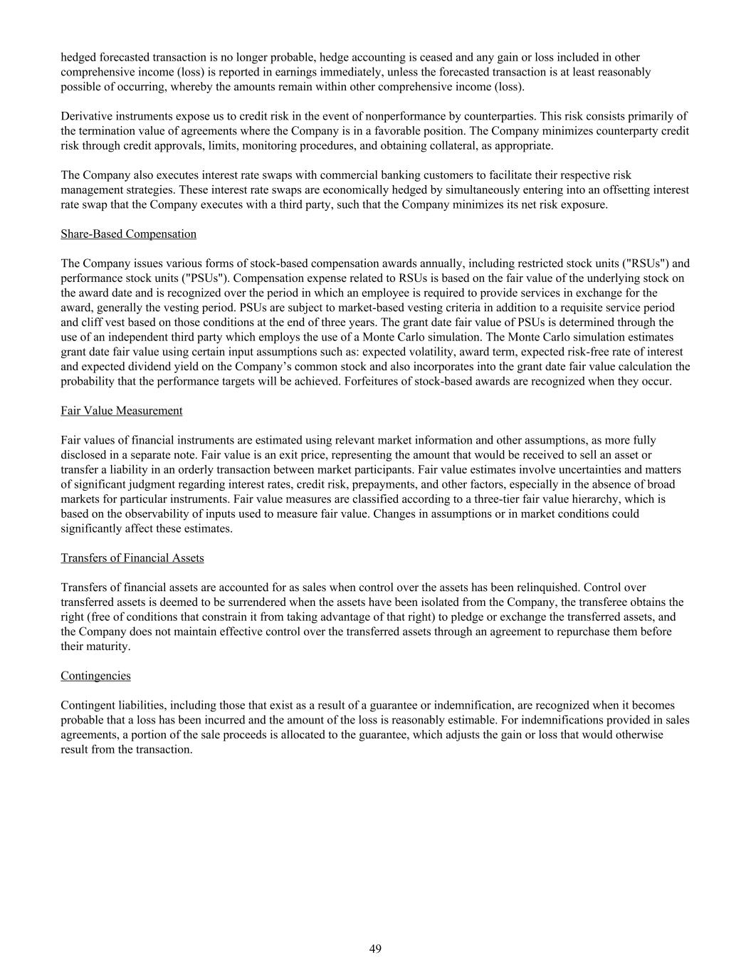 被套期的预测交易不再可能发生,停止套期会计并立即在收益中报告计入其他综合收益(损失)的任何收益或损失,除非预测交易至少是合理可能发生的,因此该金额保持在其他综合收益(损失)内。在交易对手不履约的情况下,衍生工具使我们面临信用风险。这一风险主要包括公司处于有利地位的协议的终止价值。公司酌情通过信贷审批、限额、监控程序、获取抵押品等方式,将交易对手信用风险降至最低。该公司还与商业银行客户执行利率互换,以促进他们各自的风险管理策略。这些利率掉期通过同时订立公司与第三方执行的冲销利率掉期进行经济对冲,从而使公司最大限度地减少其净风险敞口。基于股份的薪酬公司每年发放各种形式的基于股份的薪酬奖励,包括限制性股票单位(“RSU”)和绩效股票单位(“PSU”)。与RSU相关的补偿费用基于授予日的基础股票的公允价值,并在要求员工提供服务以换取奖励的期间内确认,通常是归属期。除了必要的服务期和三年结束时基于这些条件的悬崖背心外,PSU还需遵守基于市场的归属标准。PSU的授予日公允价值通过采用蒙特卡洛模拟的独立第三方确定。蒙特卡洛模拟使用某些输入假设估计授予日公允价值,例如:预期波动性、授予期限、预期无风险利率和公司普通股的预期股息收益率,还将业绩目标实现的概率纳入授予日公允价值计算。基于股票的奖励的没收在发生时予以确认。公允价值计量金融工具的公允价值是使用相关市场信息和其他假设估计的,如在单独的附注中更充分披露的那样。公允价值是一种退出价格,代表在市场参与者之间的有序交易中出售资产或转移负债所获得的金额。公允价值估计涉及有关利率、信用风险、预付款和其他因素的不确定性和重大判断事项,特别是在特定工具缺乏广阔市场的情况下。公允价值计量按照三层公允价值层次进行分类,这是基于用于计量公允价值的输入值的可观察性。假设或市场状况的变化可能会对这些估计产生重大影响。金融资产转让金融资产转让在资产控制权被放弃时作为出售入账。对受让资产的控制权在资产已与公司隔离、受让方取得受让资产质押或交换的权利(不附带限制其利用该权利的条件)且公司未通过协议在其到期前回购的方式保持对受让资产的有效控制的情况下,视为让出。或有负债或有负债,包括因担保或赔偿而存在的负债,在很可能发生损失且损失金额可合理估计时予以确认。对于销售协议中规定的赔偿,销售收益的一部分分配给担保,该担保调整了交易原本会产生的收益或损失。49