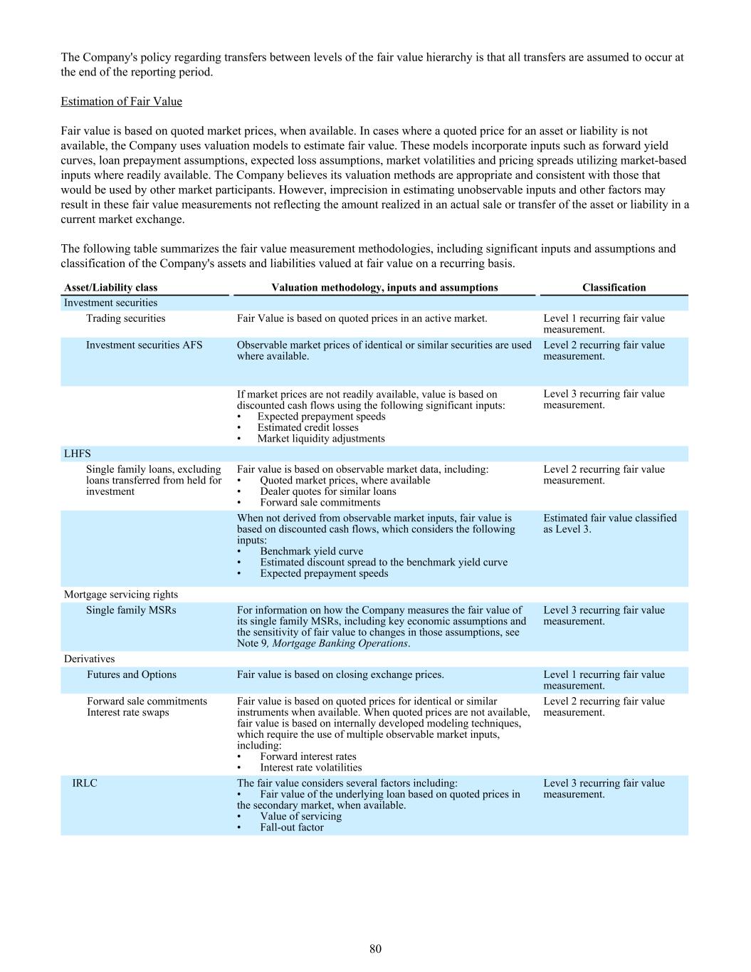 公司关于公允价值层级之间转移的政策是假设所有转移发生在报告期末。公允价值公允价值的估计以市场报价为基础,如有。在无法获得资产或负债报价的情况下,公司采用估值模型对公允价值进行估值。这些模型包含了诸如远期收益率曲线、贷款提前还款假设、预期损失假设、市场波动和利用随时可用的基于市场的输入定价价差等输入。该公司认为其估值方法是适当的,并与其他市场参与者将使用的方法一致。然而,估计不可观察输入值和其他因素的不精确可能导致这些公允价值计量不能反映在当前市场交易中实际出售或转移资产或负债实现的金额。下表概述了公允价值计量方法,包括按经常性基础以公允价值估值的公司资产和负债的重要输入和假设以及分类。资产/负债类别估值方法、输入值和假设分类投资证券交易证券公允价值以活跃市场中的报价为基础。第1级经常性公允价值计量。投资证券AFS可观察的相同或类似证券的市场价格在可用的情况下使用。第2级经常性公允价值计量。如果市场价格不容易获得,则价值基于使用以下重要投入的贴现现金流:•预期提前还款速度•估计信贷损失•市场流动性调整第3级经常性公允价值计量。LHFS单一家庭贷款,不包括为投资而从持有转移的贷款公允价值基于可观察的市场数据,包括:•报价市场价格(如有)•类似贷款的经销商报价•远期销售承诺Level 2经常性公允价值计量。如果不是从可观察的市场投入中得出,则公允价值基于贴现现金流,其中考虑了以下投入:•基准收益率曲线•与基准收益率曲线的估计贴现价差•预期提前还款速度分类为第3级的估计公允价值。抵押服务权单户MSR有关公司如何计量其单户MSR的公允价值的信息,包括关键经济假设和公允价值对这些假设变化的敏感性,请参见附注9,抵押银行业务。第3级经常性公允价值计量。衍生品期货和期权公允价值以收盘交易所价格为基础。第1级经常性公允价值计量。远期销售承诺利率掉期公允价值基于相同或类似工具的报价(如果有)。当无法获得报价时,公允价值基于内部开发的建模技术,这些技术需要使用多个可观察的市场输入,包括:•远期利率•利率波动2级经常性公允价值计量。IRLC公允价值考虑了几个因素,包括:•基于二级市场报价的基础贷款的公允价值(如果有)。•服务价值•辐射因子3级经常性公允价值计量。80