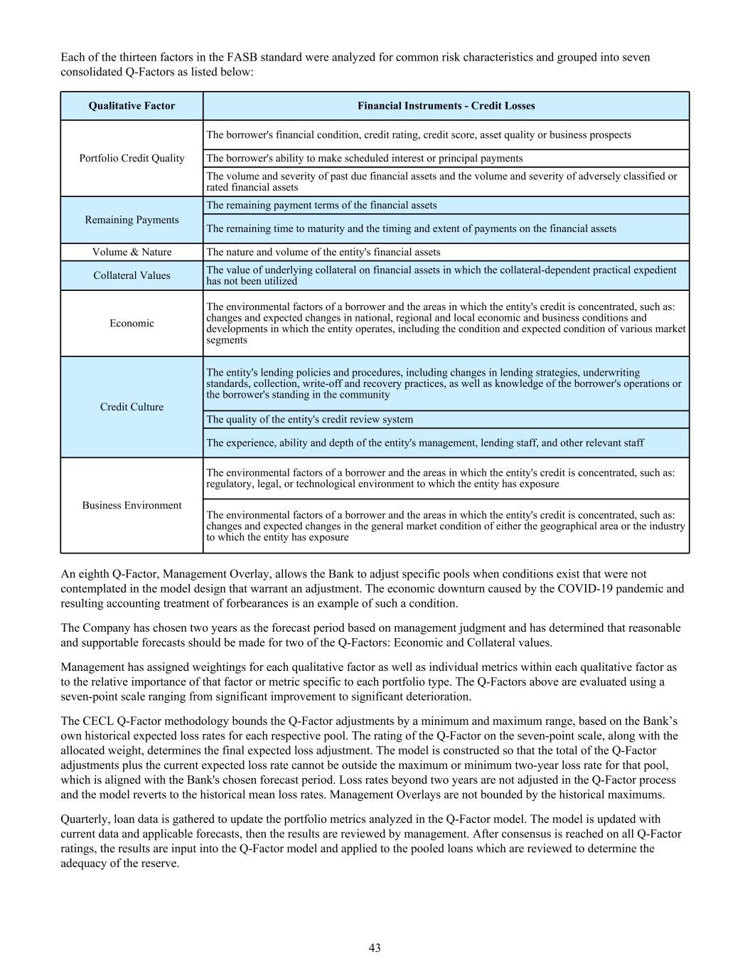 对FASB标准中的13个因素中的每一个因素进行了共同风险特征分析,并将其分为以下七个合并的Q-因素:定性因素金融工具-信用损失组合信用质量借款人的财务状况、信用评级、信用评分、资产质量或业务前景借款人按期支付利息或本金的能力逾期金融资产的数量和严重程度以及不良分类或评级金融资产的数量和严重程度剩余付款金融资产的剩余付款期限金融资产的剩余到期时间和金融资产的付款时间和程度数量和性质实体金融资产的数量和抵押品价值未使用依赖抵押品的实务权宜之计的金融资产的基础抵押品的价值经济借款人的环境因素和实体信贷集中的领域,例如:国家、区域和地方经济和商业条件以及实体经营所在的发展的变化和预期变化,包括各个细分市场的状况和预期状况信用文化实体的贷款政策和程序,包括贷款策略、承销标准、催收、核销和回收做法的变化,以及了解借款人的经营情况或借款人在社区中的地位实体信用审查系统的质量实体管理层的经验、能力和深度,放贷人员,以及其他相关工作人员营商环境借款人的环境因素和实体信用集中的领域,如:监管、法律或技术环境,实体所暴露的借款人的环境因素和实体信用集中的领域,例如:实体有风险敞口的地理区域或行业的一般市场状况的变化和预期变化第八个Q-因素,即管理层叠加,允许银行在存在模型设计中未考虑到的需要调整的条件时调整特定的资金池。新冠疫情导致的经济下滑以及由此导致的会计处理忍耐就是这种情况的一个例子。公司根据管理层的判断选择了两年作为预测期,并确定应对其中两个Q-因素做出合理且可支持的预测:经济价值和抵押品价值。管理层已为每个定性因素以及每个定性因素内的个别指标分配了权重,以确定该因素的相对重要性或特定于每个投资组合类型的指标。上述Q-因子使用从显著改善到显著恶化的七分制进行评估。CECL Q-Factor方法将Q-Factor调整限定在最小和最大范围内,基于银行自己对每个相应池的历史预期损失率。Q-因子在七分制上的评级,连同分配权重,决定了最终的预期损失调整。该模型的构建使得Q-因子调整的总和加上当前的预期损失率不能超出该池的最大或最小两年损失率,这与银行选择的预测期一致。超过两年的损失率在Q-Factor过程中不进行调整,模型恢复到历史平均损失率。管理叠加不受历史最大值的限制。每季度,收集贷款数据以更新Q-Factor模型中分析的投资组合指标。该模型使用当前数据和适用的预测进行更新,然后由管理层审查结果。在对所有Q-Factor评级达成共识后,将结果输入Q-Factor模型,应用于被审查以确定准备金充足性的集合贷款。43